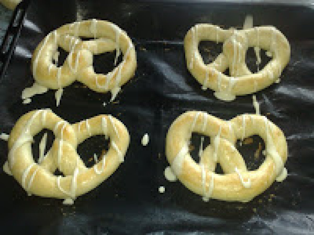 Se amesteca faina cu apa si sarea pana se face un aluat grosut dar care curge. Cam ca si aluatul de clatite. - Dupa aprox. 10 minute covrigii incep sa se rumeneasca . Se scot atunci din cuptor si se toarna cu o lingura ,in zig zag , aluatul sarat preparat anterior si se mai baga 5 minute la cuptor timp in care covrigii se mai rumenesc un pic iar aluatul sarac se usca.