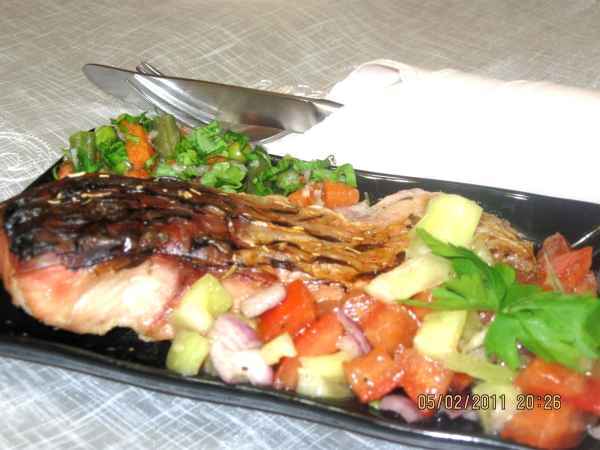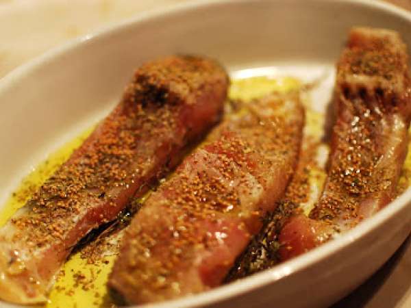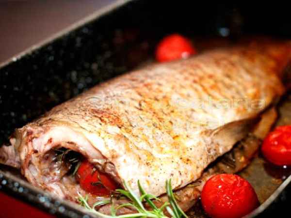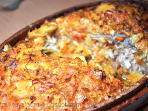 - Pestele, curat de solzi si intestine, se spala, se taie in felii, se sareaza si se pune cu usturoi tocat, 2 ardei grasi taiati fideluta, piper si cimbru intr-o tava cu ulei, la cuptor.