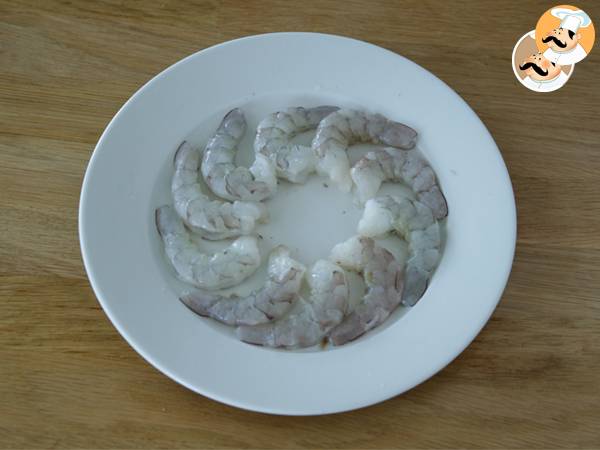 Aranjati crevetii in foia de placinta intr-o tava acoperita cu hartie de copt. Coaceti 10 minute la 180° C.