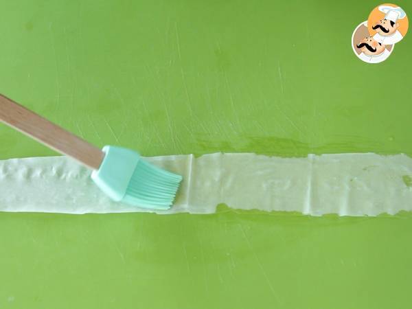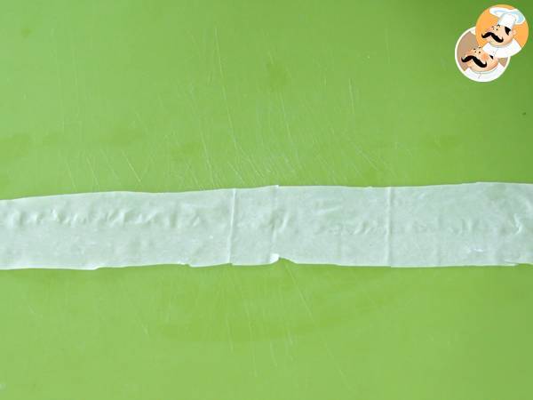 Intindeti foile de placinta si taiati-le in 5 fasii longitudinale.
