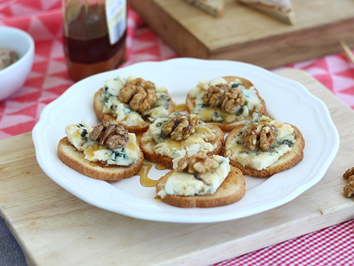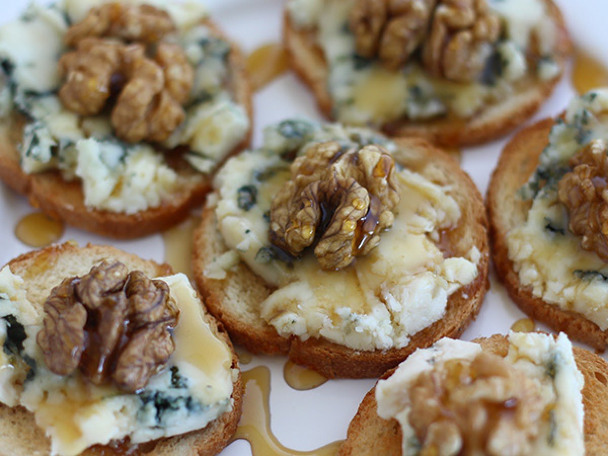 Crostini cu gorgonzola, nuca si miere