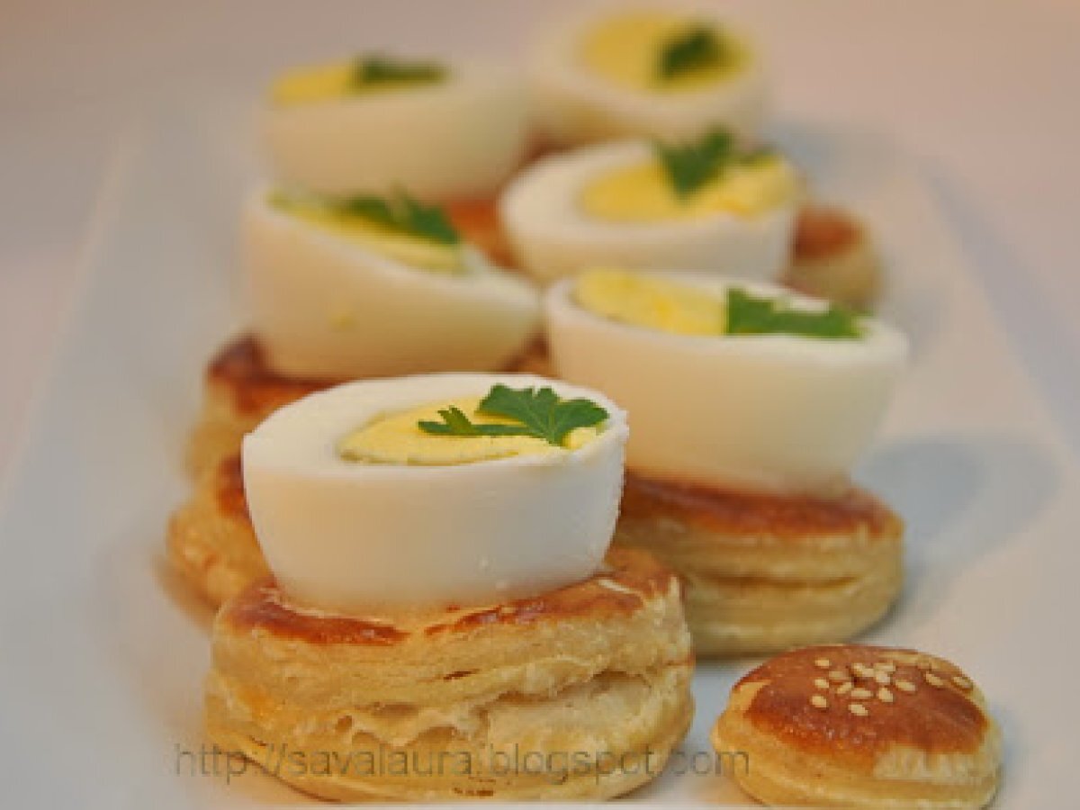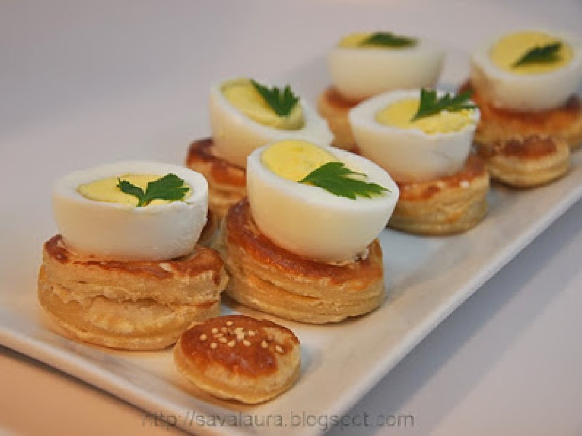 Cuiburi de foitaj cu oua PrecedentulUrmătorul AperitivFoarte ușor35 min Trimite unui prieten Printează pagina Adresează o întrebare autorului Postează o poză cu rețeta gătită de tine Ingrediente 8 500 g. foitaj congelat 4 oua 1 galbenus 100 g. crema de cascaval sau Almette, 2, 3 cepe verzi frunze de patrunjel susan