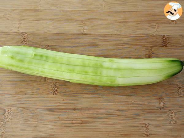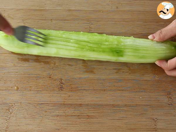 Folosind o furculiță, răzuiți marginea castravetelui. Tăiați și aruncați capetele și tăiați în aproximativ 8 bucăți.