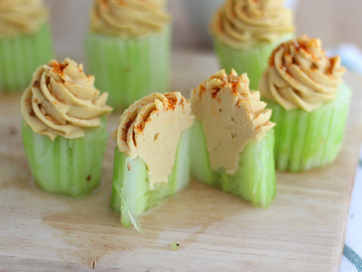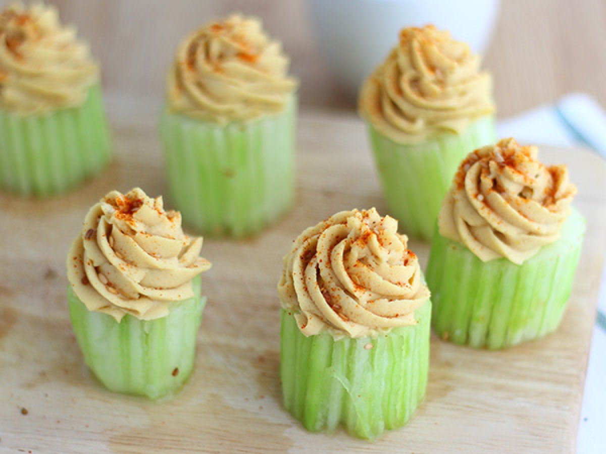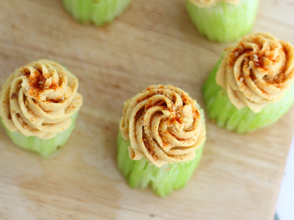 Puneți hummus-ul într-o pungă de patiserie prevăzută cu o duză canelată și umpleți bucățile de castravetele, ca pe un cupcake.