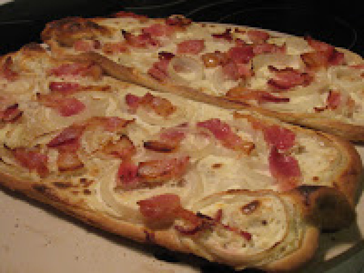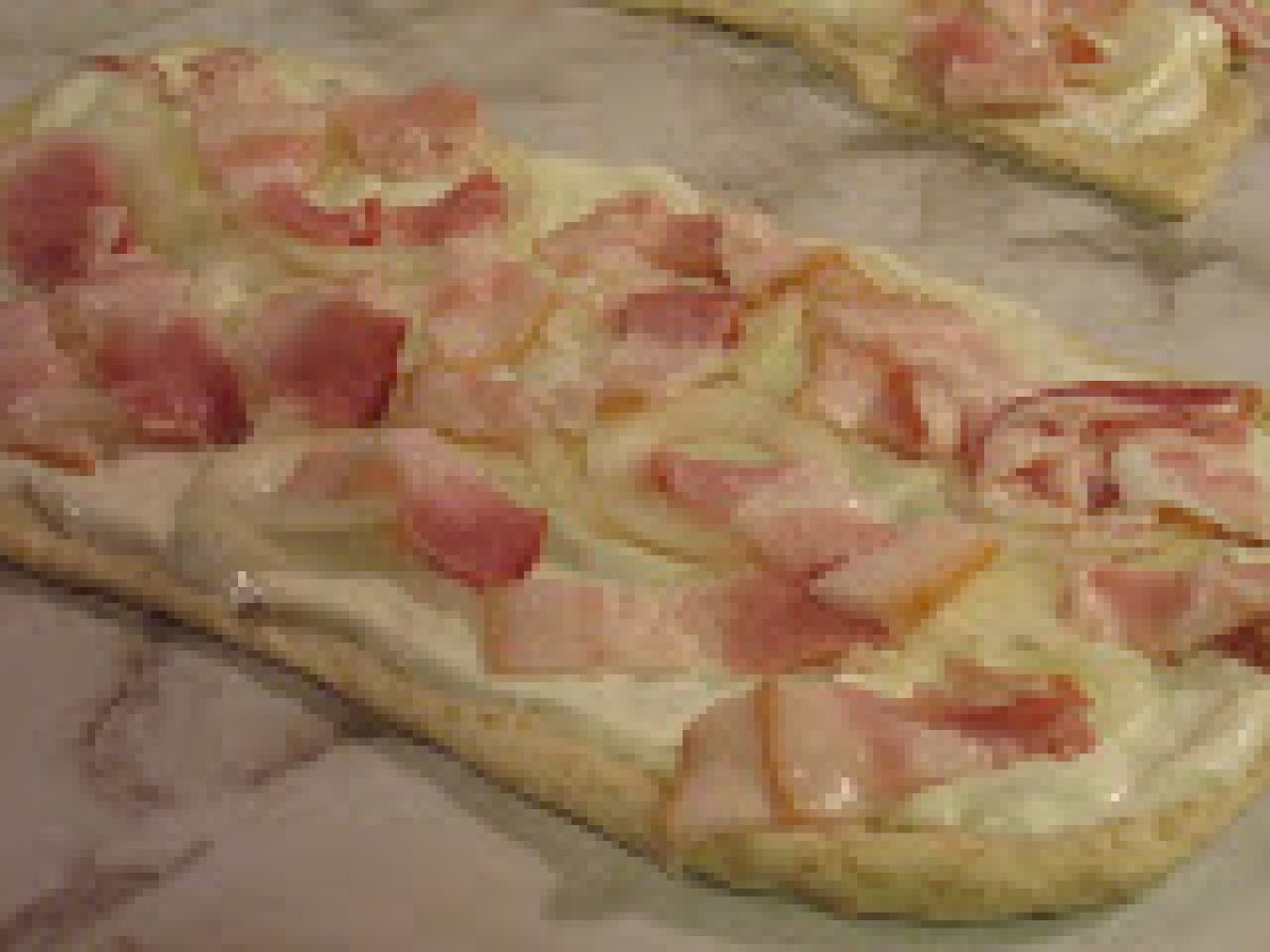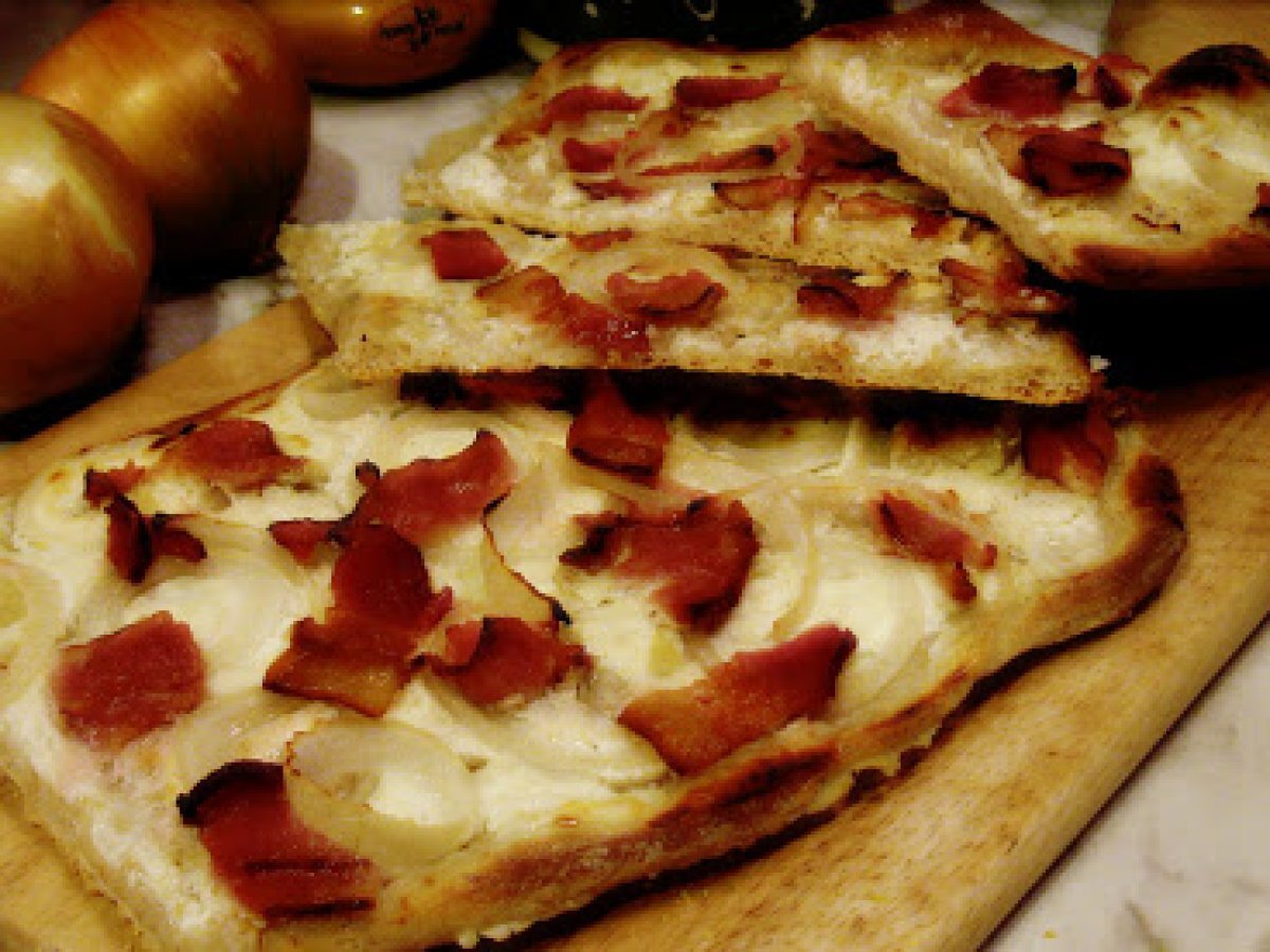 Flammkuchen (tarte flambée) PrecedentulUrmătorul AperitivFoarte ușor30 min Trimite unui prieten Printează pagina Adresează o întrebare autorului Postează o poză cu rețeta gătită de tine Ingrediente 2 2 linguri de ulei de masline. 2 cepe (un soi dulce) taiate rondele, bacon 150-200g, taiat feliute, o cana de smantana groasa, sare, piper dupa gust si putina nucsoara