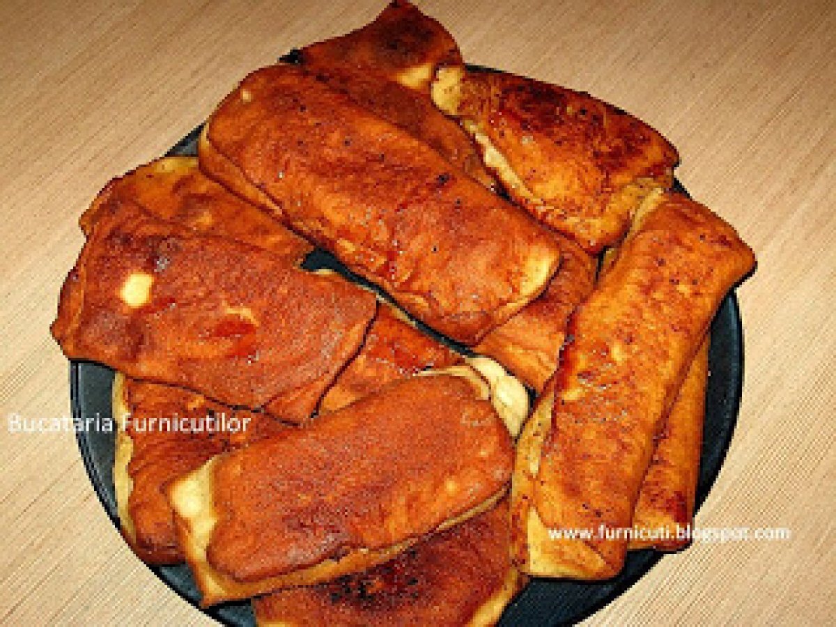 - Taiem cu cutitul patrate sau dreptunghiuri din aluat, cam cat o palma de mari. In mijlocul lor punem cate 1 lingurita sau 2 de branza. Daca avem patrate, putem sa facem triunghiuri, adica sa aducem un colt peste coltul opus. Daca avem dreptunghiuri, impaturim tot in forma de dreptunghi, aducand o latura peste cea opusa.