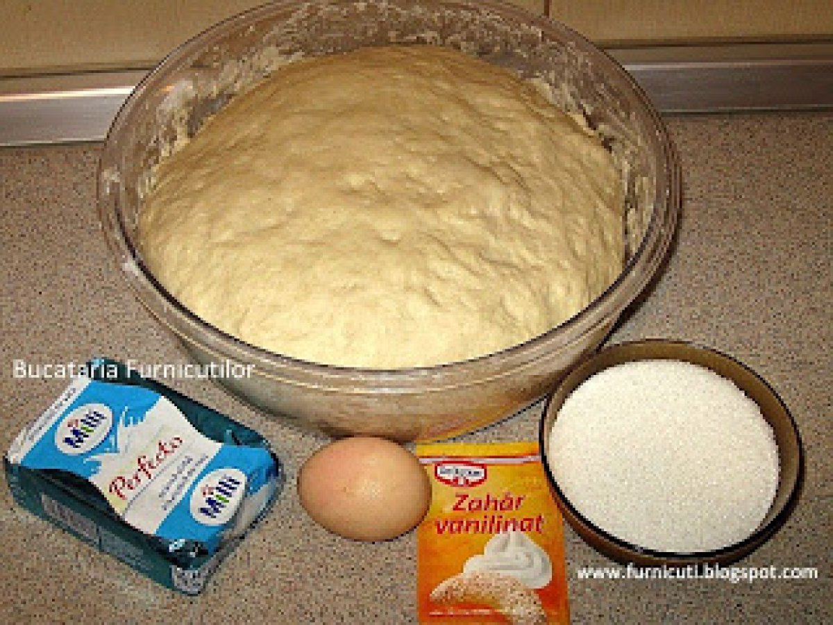 - Cat timp sta aluatul sa creasca, pregatim branza, adica o amestecam cu oul, zaharul si zaharul vanilat. Trebuie sa aveti grija si sa nu puneti mult zahar pentru ca sa nu fie prea lichida branza, fiindca va curge si gogosile se vor desface si nu ar fi bine. Daca cumva este branza mai lichida, puteti adauga o lingurita de gris, care mai absoarbe din umezeala.