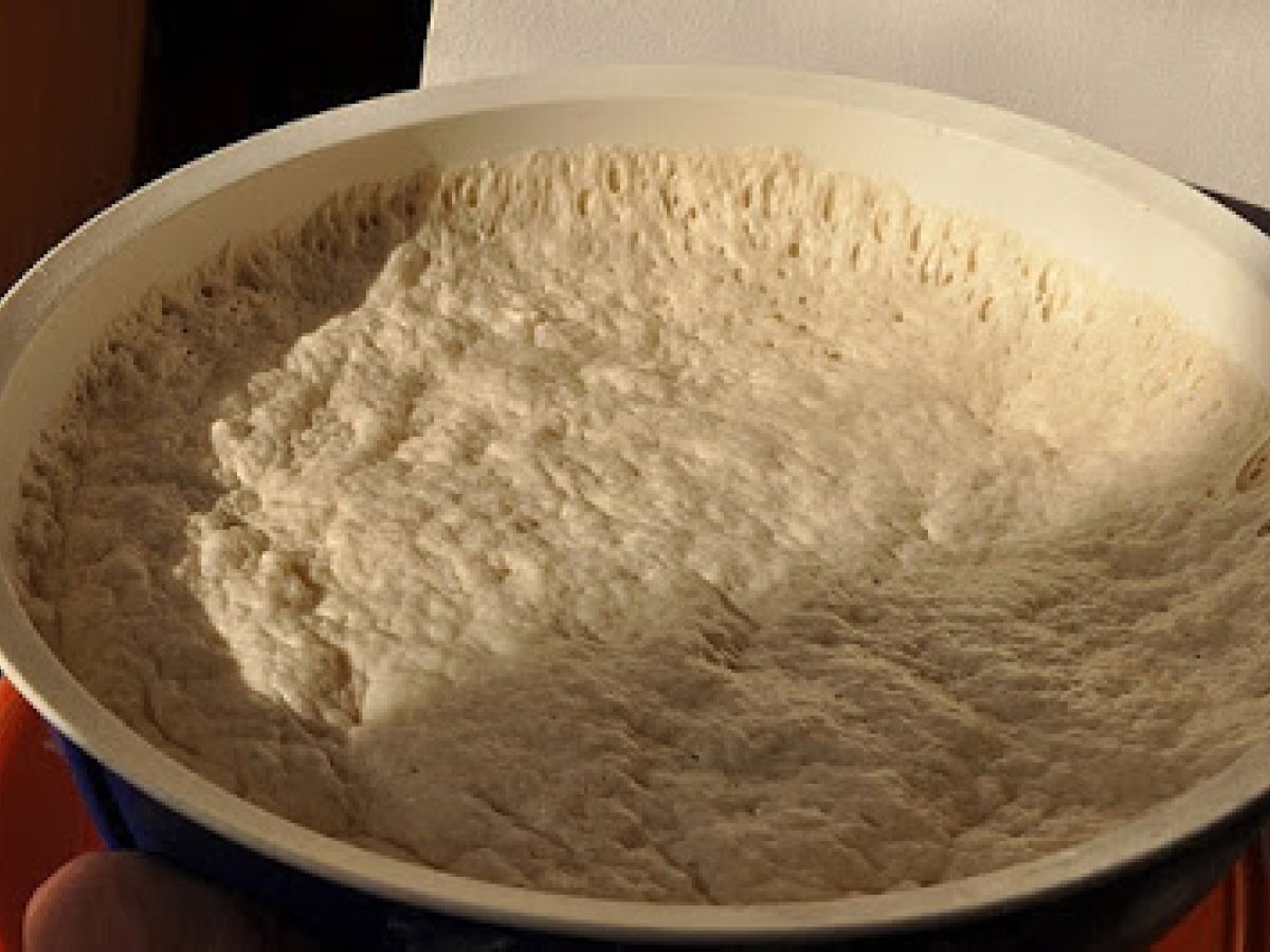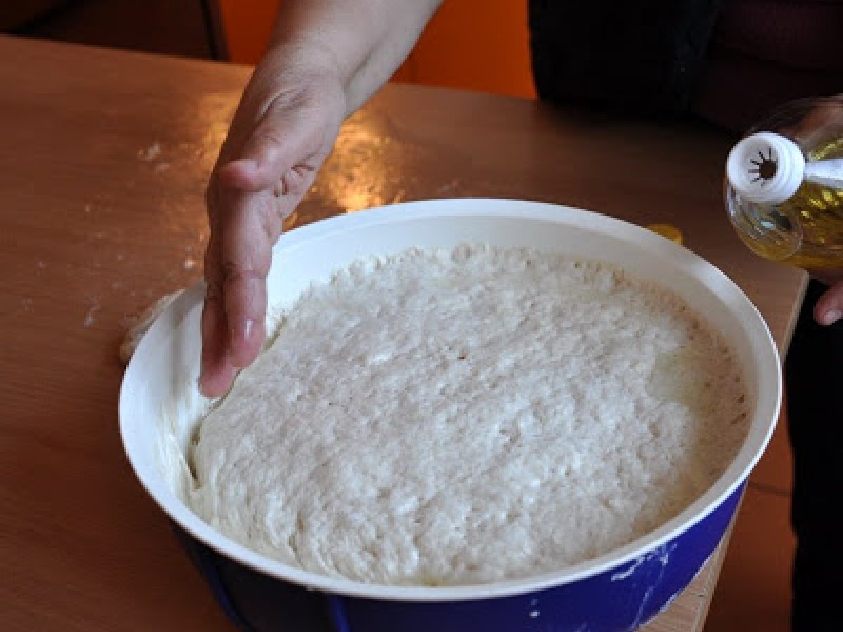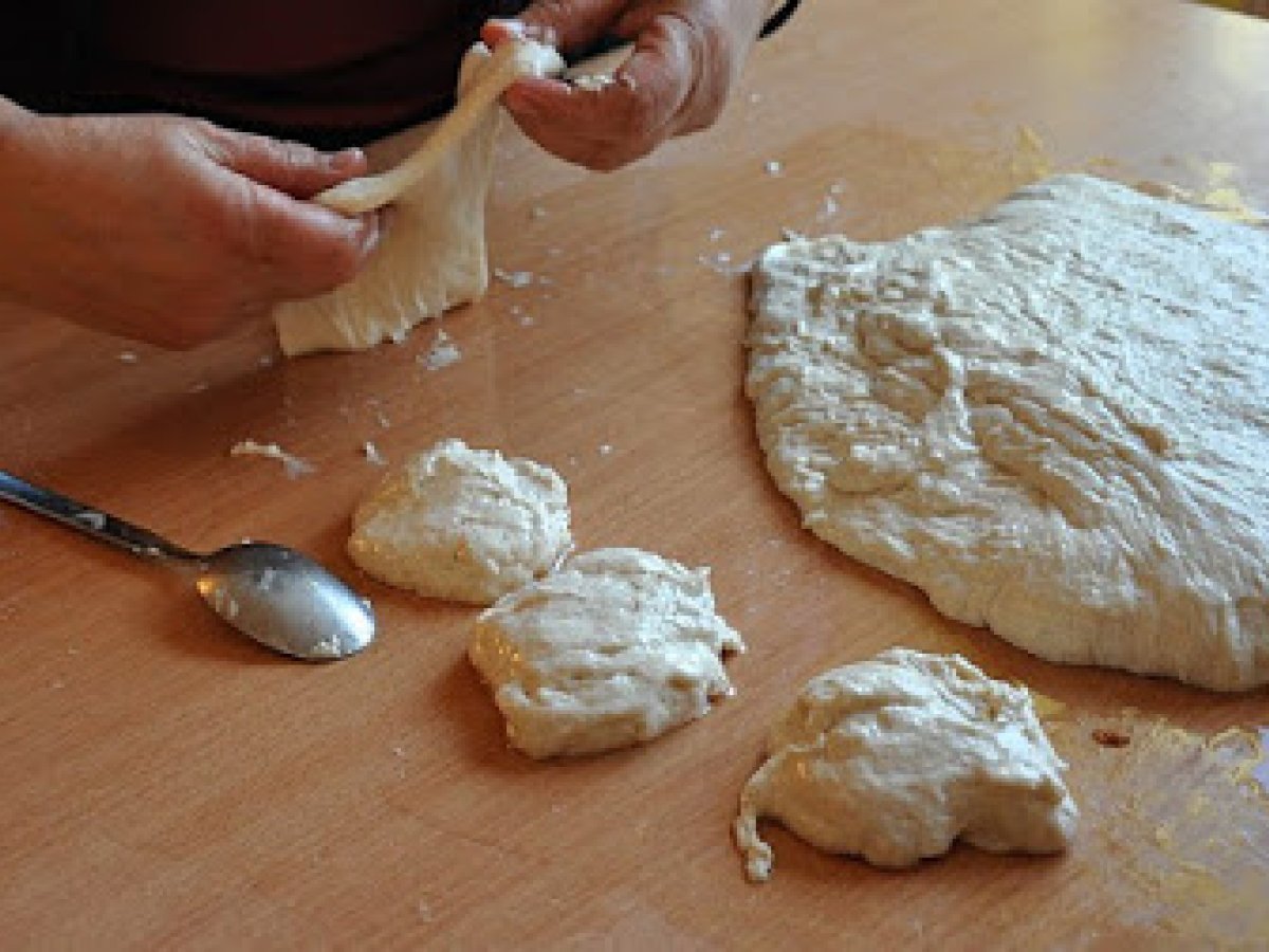 Se lasa la dospit intr-un loc calduros si lipsit de curenti de aer, pana cand arata cam asa. - Ca sa-l putem manevra ne ungem mainile cu ulei si il desprindem cu grija de pe margini.