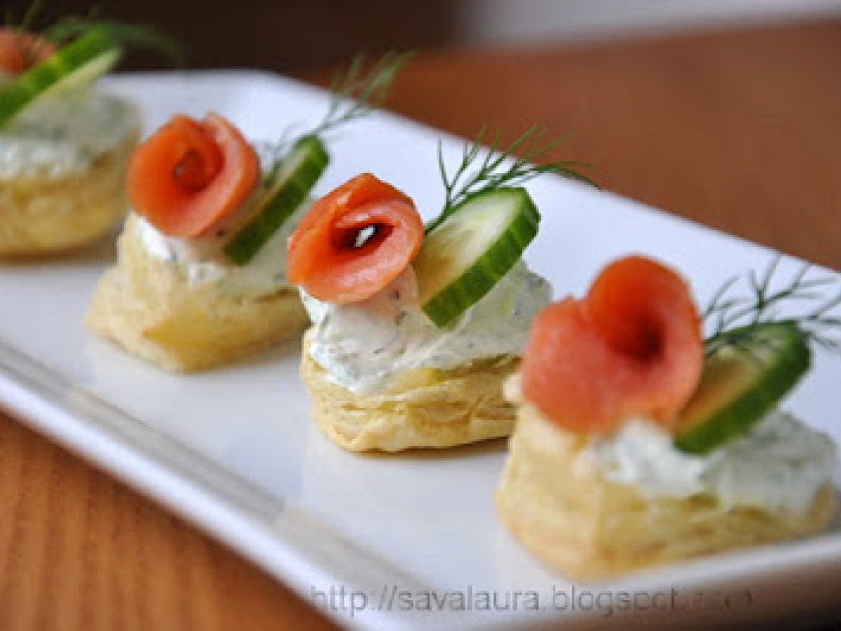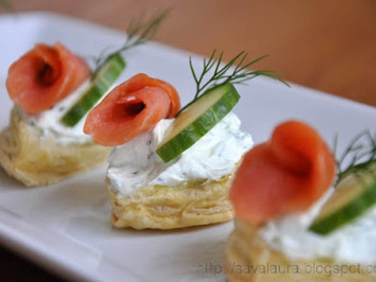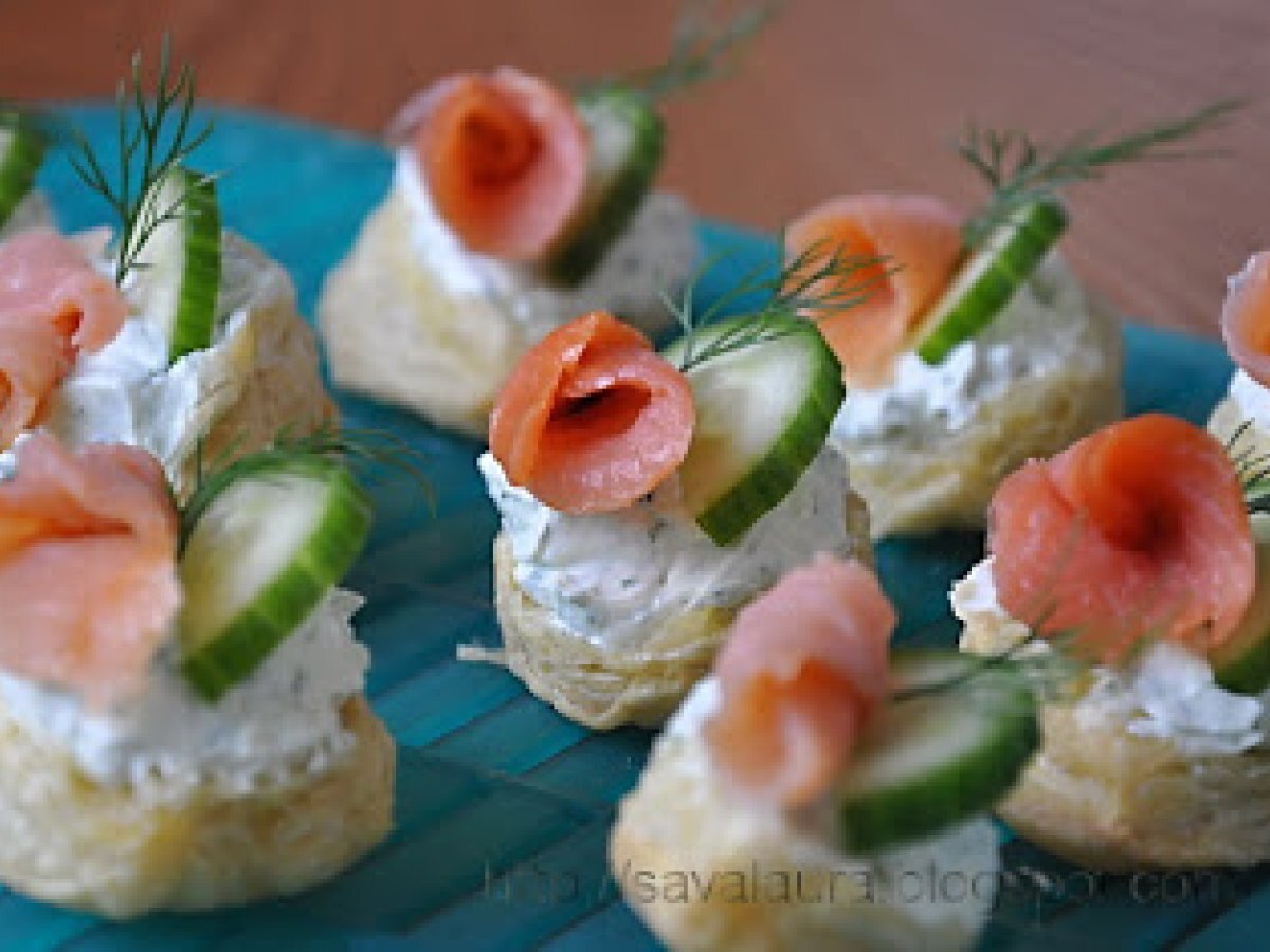 "luntrite" cu somon PrecedentulUrmătorul AperitivFoarte ușor45 min Trimite unui prieten Printează pagina Adresează o întrebare autorului Postează o poză cu rețeta gătită de tine Ingrediente 12 1 pachet aluat foitaj Morarita, Linco, Bella, etc. 200 g. branza de vaci sare, piper 1 lingura suc de lamaie 1 lingura marar tocat 1 castravete 150 g. somon afumat marar pentru ornat