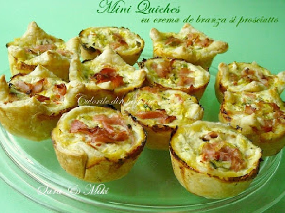 Mini quiches cu crema de branza si prosciutto PrecedentulUrmătorul AperitivFoarte ușor45 min Trimite unui prieten Printează pagina Adresează o întrebare autorului Postează o poză cu rețeta gătită de tine Ingrediente 6 1 aluat de foietaj - 400 g 1 pachet de crema de branza 2 ou 3-4 linguri smantana 1/2 praz 1/2 ardei rosu 1 rosie prosciutto crud sare piper ulei de masline