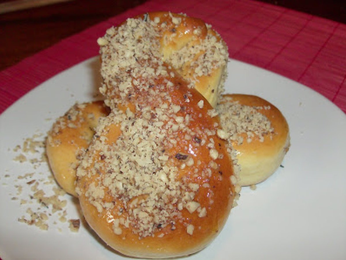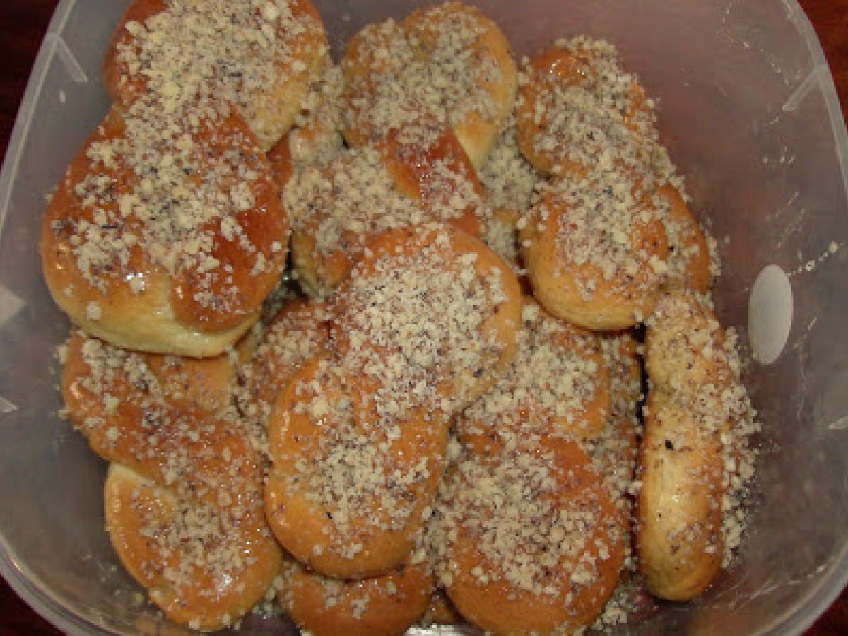 - Dupa ce scos mucenicii din cuptor, cat erau inca calzi, bagat in sirop cate1 minut pe fiecare parte. uns cu miere si presarat nuca toacata. Si mancat cu multa pofta.Sper ca si colegilor mei le-au placut.