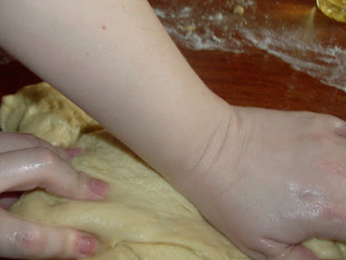 In laptele caldut topeste zaharul si sarea. Cerne faina (asta se face nu numai pentru a elimina toate impuritatile din faina, ci si pentru a o aera, ca sa iasa coca mai pufoasa). - Amesteca faina cu maiaua si laptele caldut. Poti face manual, intr-un robot cu cuva mare, sau in masina de paine. Dupa ce s-au omogenizat, adauga ouale si aromele.