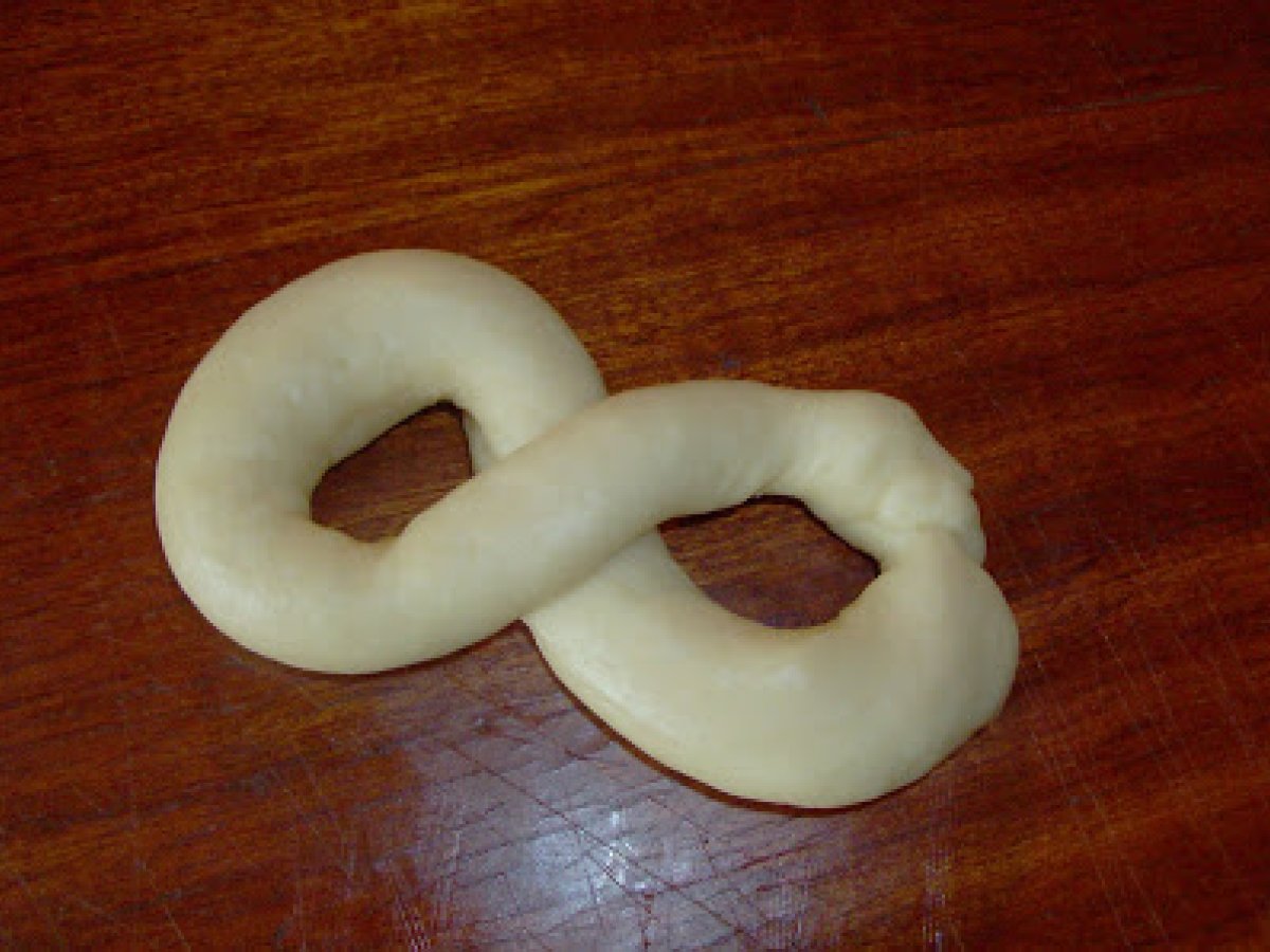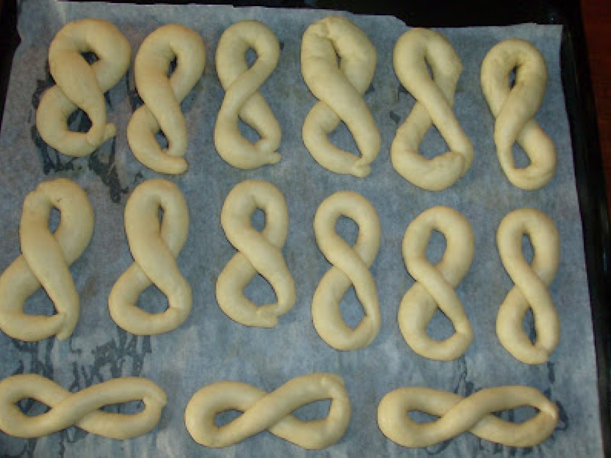 - Uns usor masa cu ulei si luat coca cat o minge de ping- pong.Din ea intins un tub lung cam de 30 cm din care facut 8 -uri. Pus in tava cu hartie pergament si copt in cuptorul preincalzit, la 200 C pentru 30 min. In timp ce se coceau facut siropul. fiert zaharul cu apa 5 minute, apoi adaugat aromele (esenta de vanilie si putin rom).