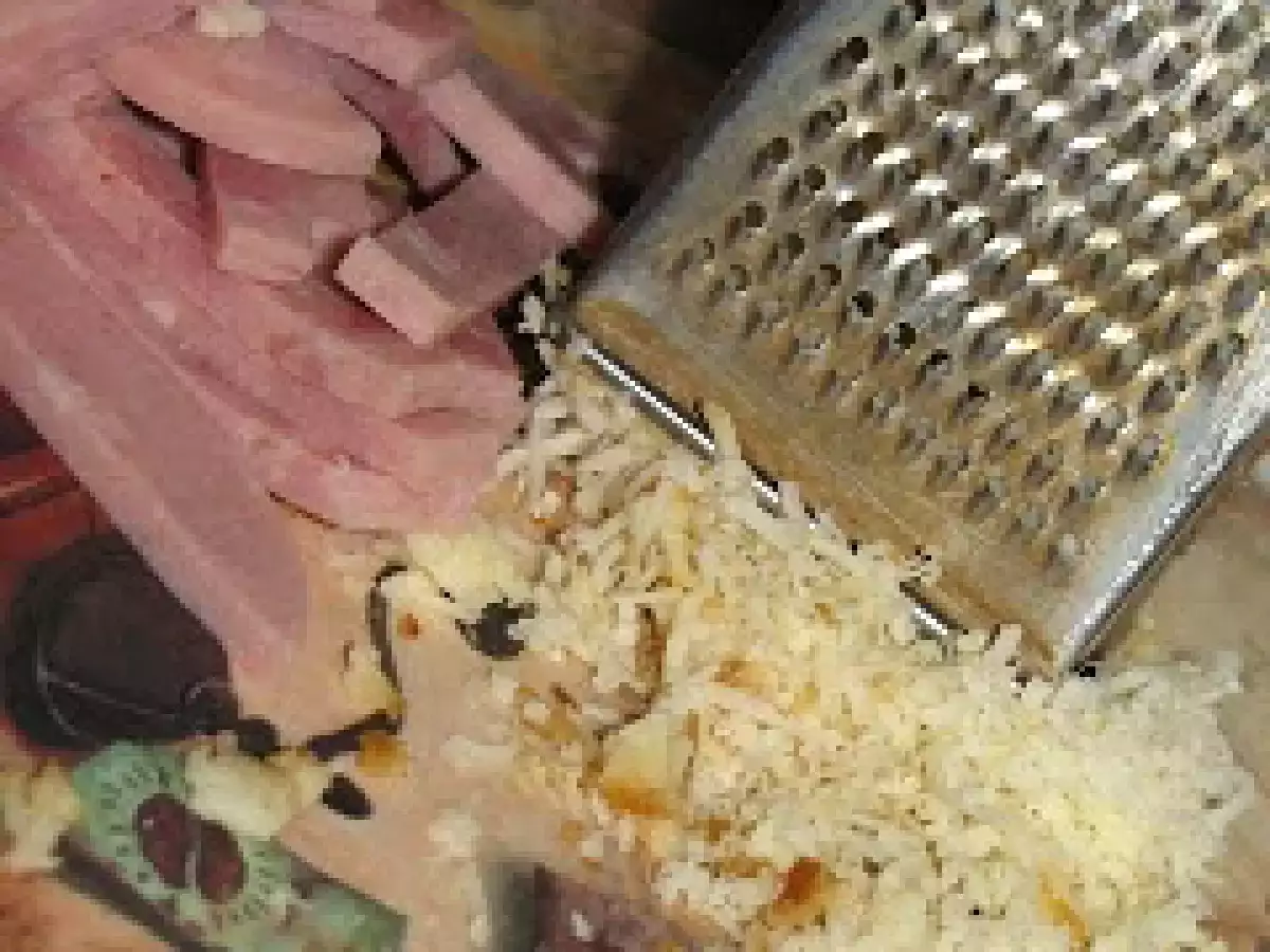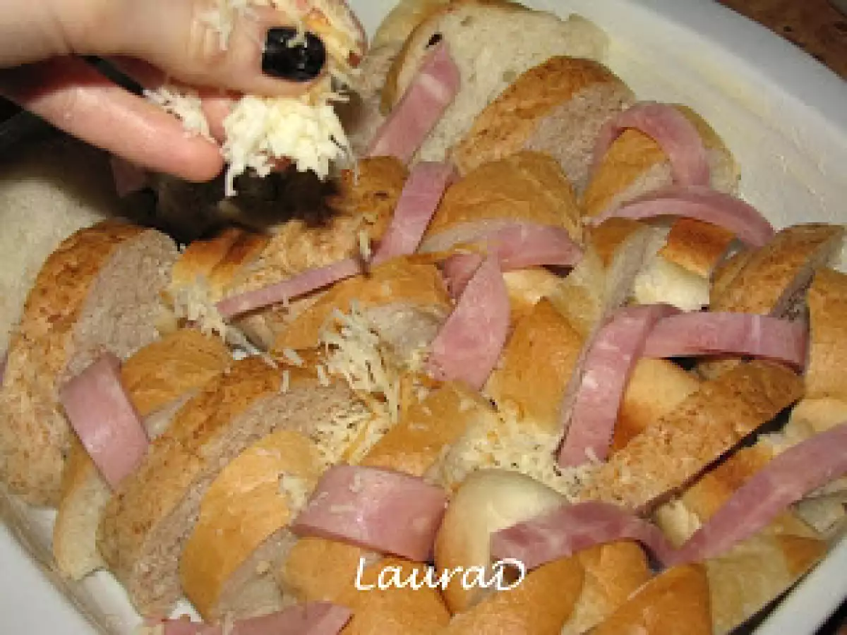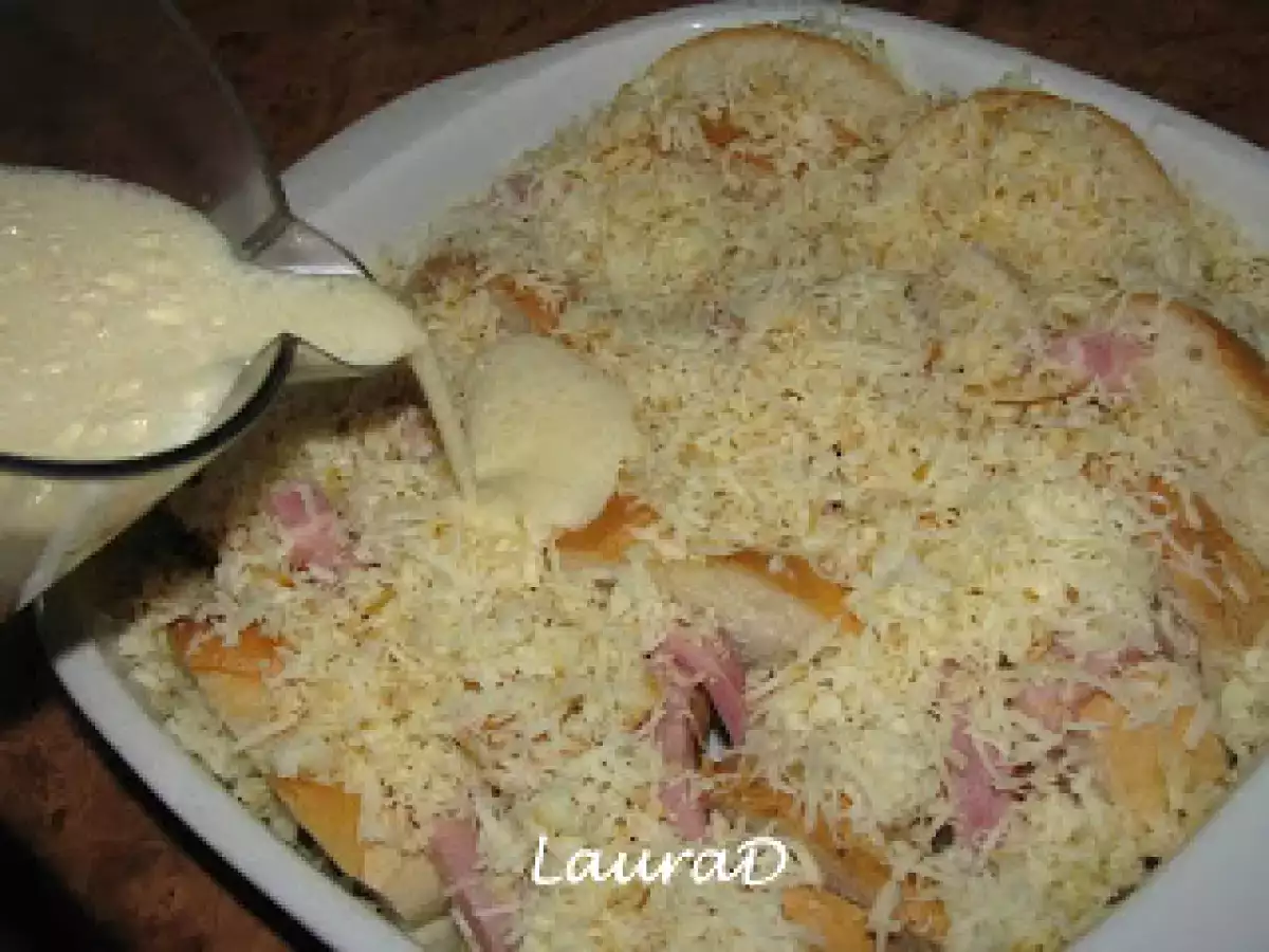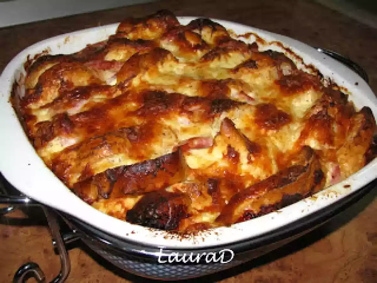 Paine crocanta la cuptor cu sunca si branza cheddar PrecedentulUrmătorul AperitivFoarte ușor1 h 50 m Trimite unui prieten Printează pagina Adresează o întrebare autorului Postează o poză cu rețeta gătită de tine Ingrediente 4 unt, pentru uns 250 g paine, taiata felii 90 g sunca, feliata 150 g branza Cheddar, rasa 3 oua 250 ml lapte 250 ml smantana 1 lingura mustar