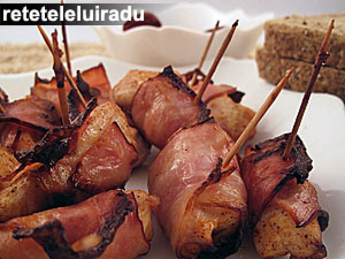 Piept de pui bardat AperitivFoarte ușor25 min Trimite unui prieten Printează pagina Adresează o întrebare autorului Postează o poză cu rețeta gătită de tine Ingrediente 2 2 jumatati de piept de pui , dezosat, fara piele sare piper 1 lingurita de boia dulce 1 lingurita de boia iute 2 lingurite de ulei de floarea-soarelui 8 felii de bacon, taiate in jumatate 16 scobitori mici