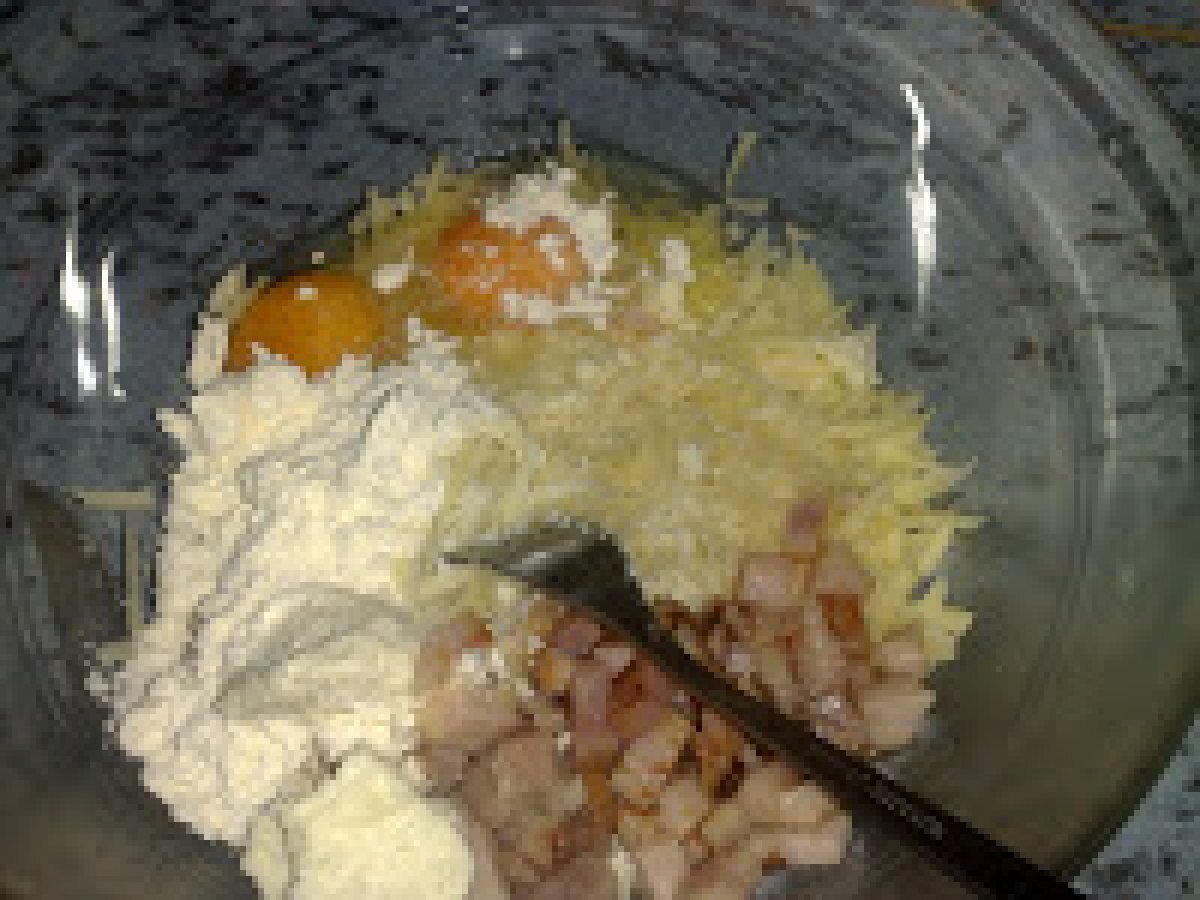 Placinte de cartofi cu bacon si branza PrecedentulUrmătorul AperitivFoarte ușor1 h 30 m Trimite unui prieten Printează pagina Adresează o întrebare autorului Postează o poză cu rețeta gătită de tine Ingrediente 8 1 kg cartofi 150 g cascaval 30 g branza de oaie 4 linguri cu varf de faina 2 oua 100 g bacon sare,piper