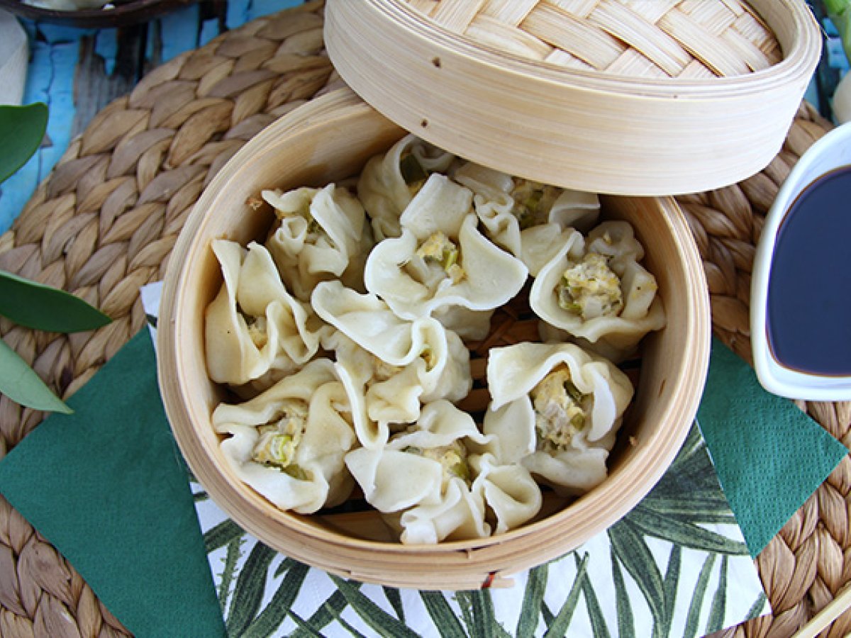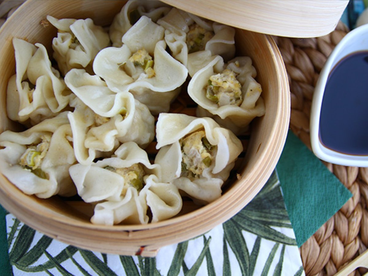 Umplutura: tocati ceapa. Taiati puiul sau folositi carne tocata de pui. Amestecati ceapa cu carnea de pui, faina de manioc, sarea, sosul de soia si piperul.