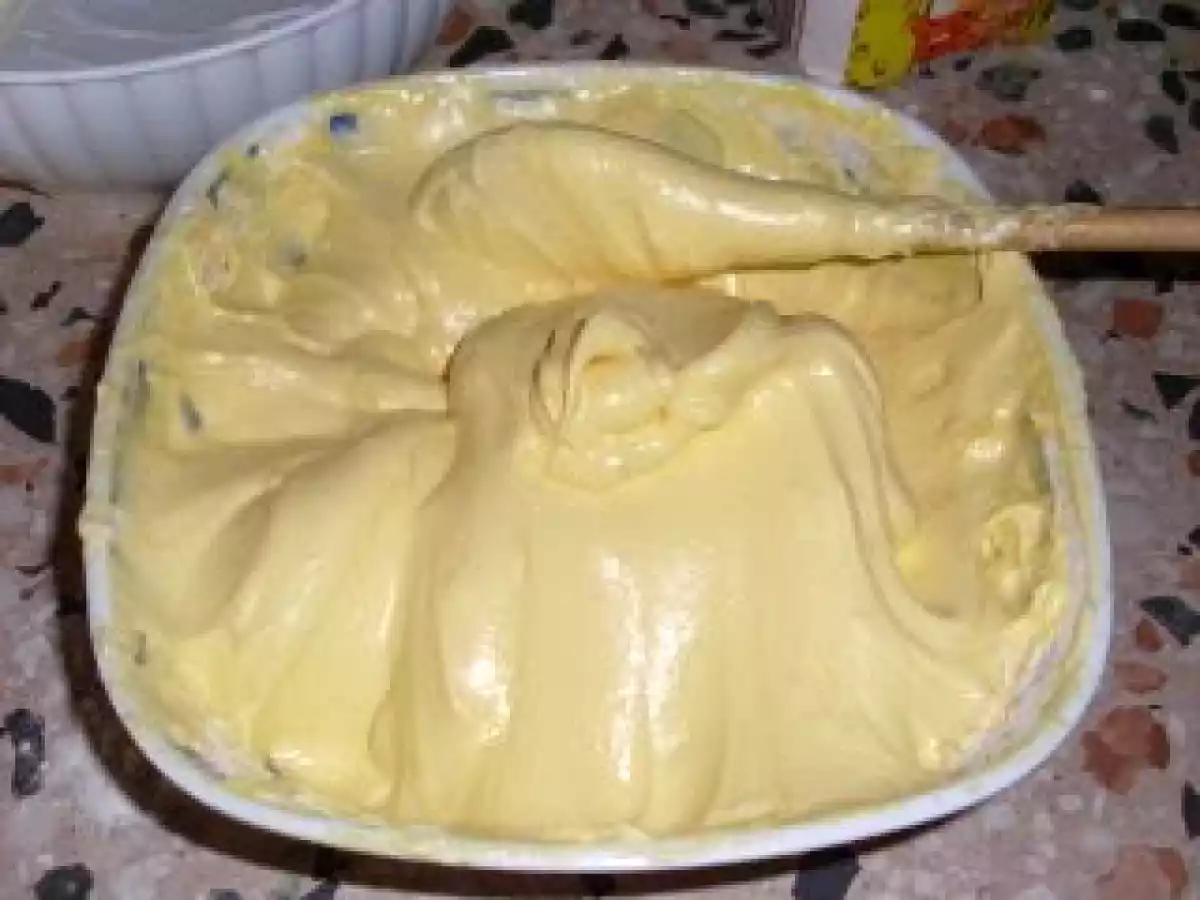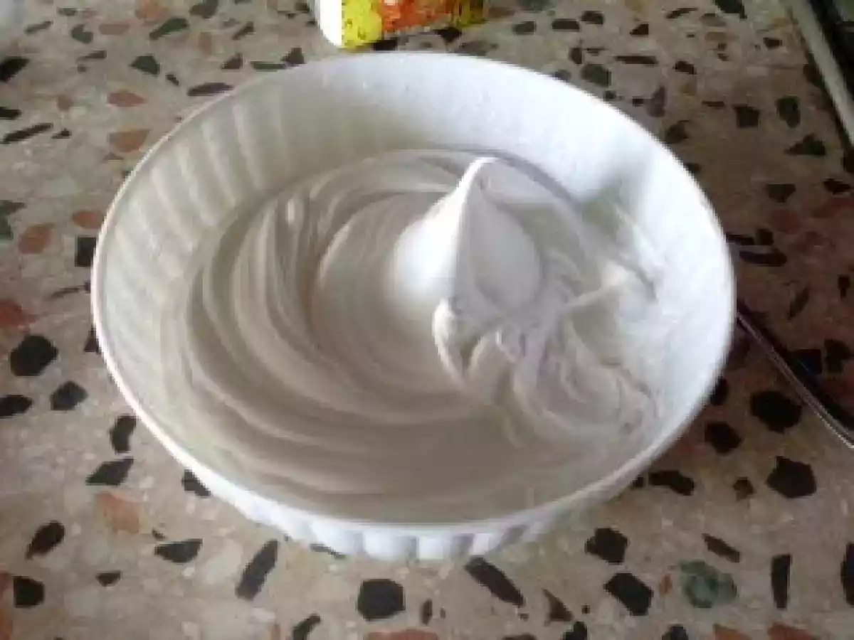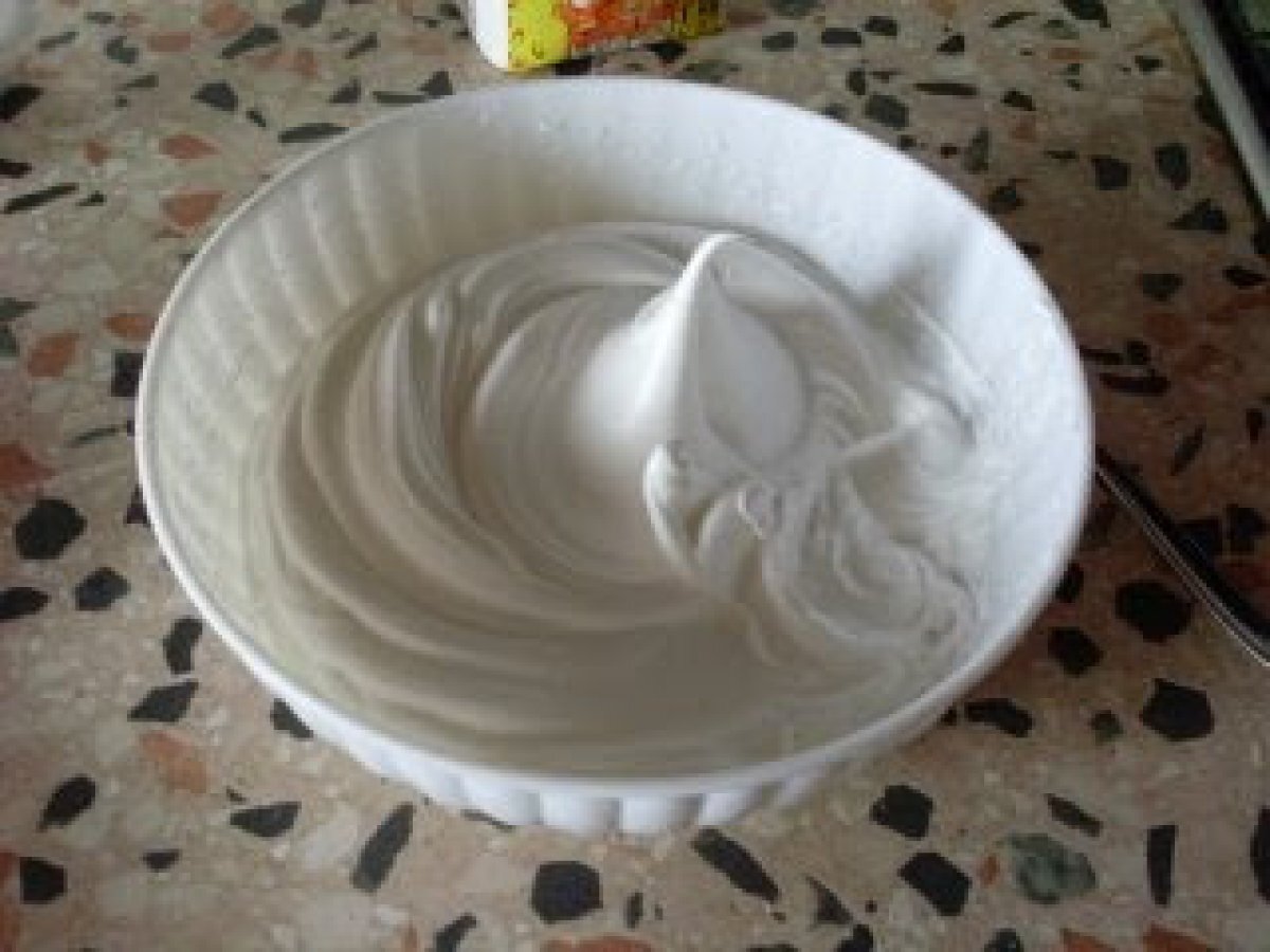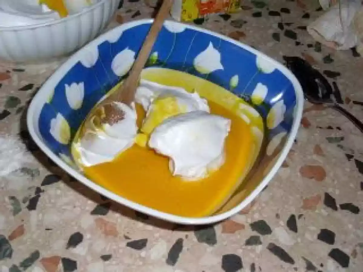 pus 4 lg de zhar in albuse siam mixat bine pana ce au devenit asa pus apoi 2 lg din albus in galbenuse si amestecat bine - Dupa care adaugat restul de albus si pus pe rand cate o lg de faina cu varf din cele 4, amestecand bien dupa fiecare. Asa arata la sfarsit compozitia :