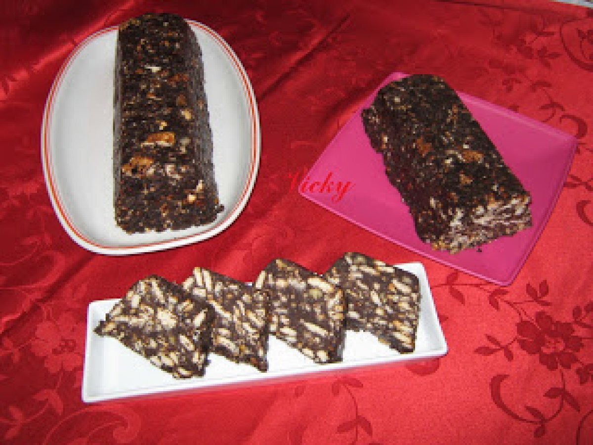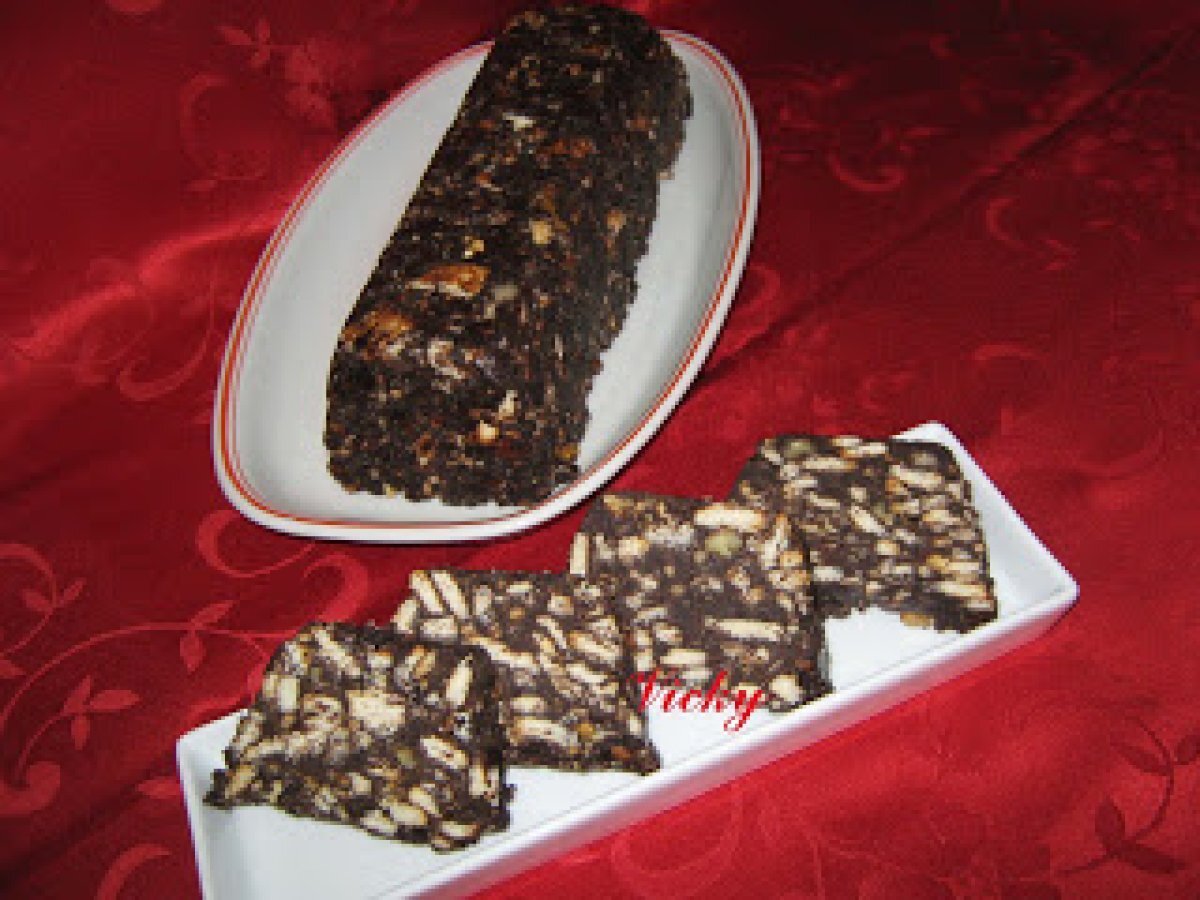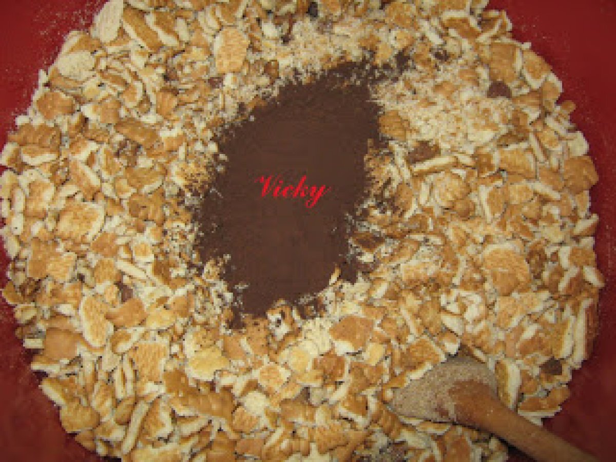 Rulada de biscuiti PrecedentulUrmătorul AperitivFoarte ușor1 oră Trimite unui prieten Printează pagina Adresează o întrebare autorului Postează o poză cu rețeta gătită de tine Ingrediente 6 1 kg biscuiti tari esenta de vanilie 200 g margarina 100 g nuca de cocos 2-3 lingurite de rom 3-4 linguri cacao 100 g migdale 200 g nuci 1 praf de sare 200 g zahar 1 ou