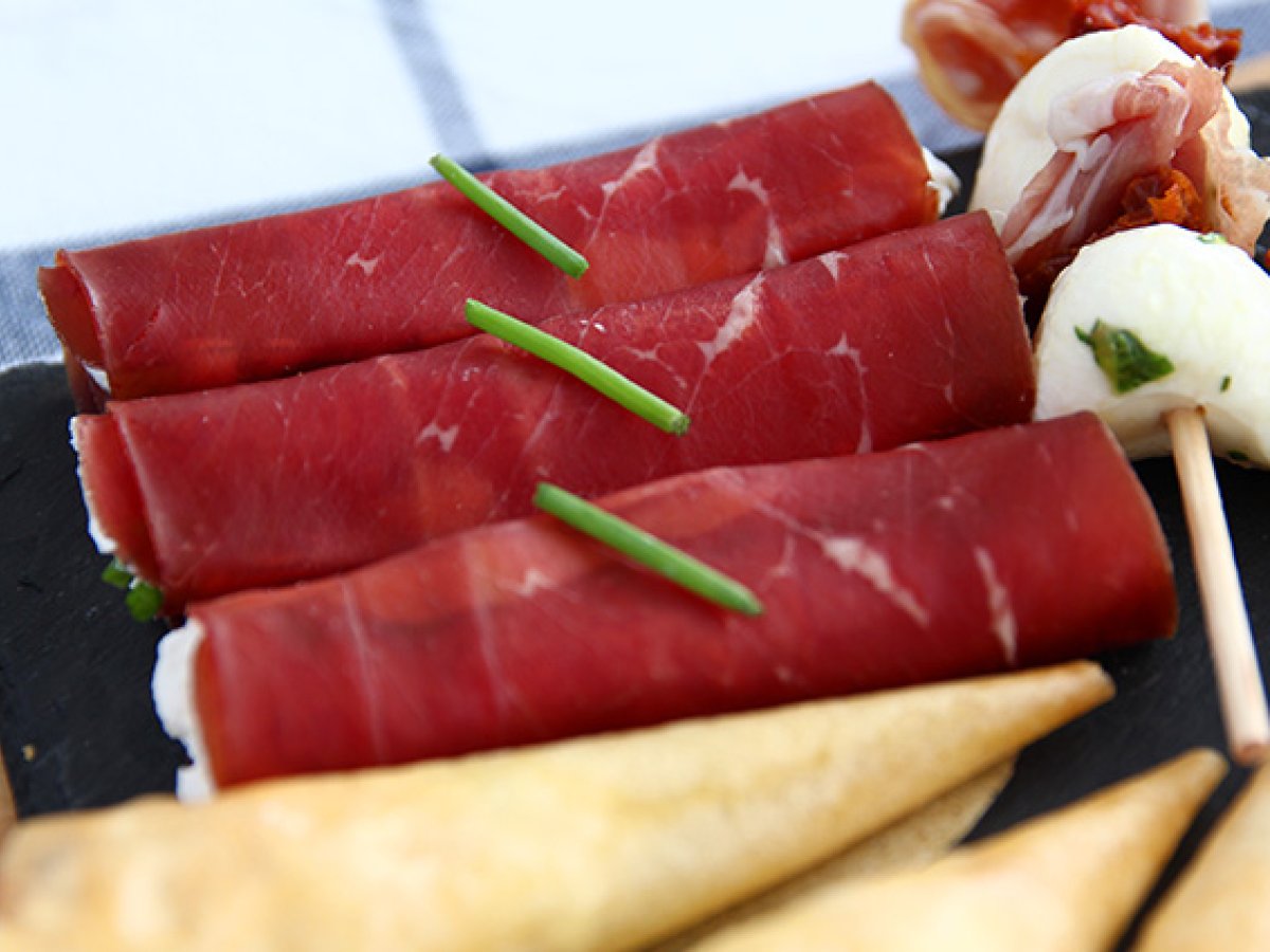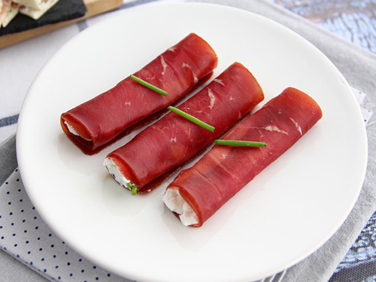 Ingredientele principale sunt 8 felii de carne uscată, 100 g de brânză proaspătă de capră și cepsoară.