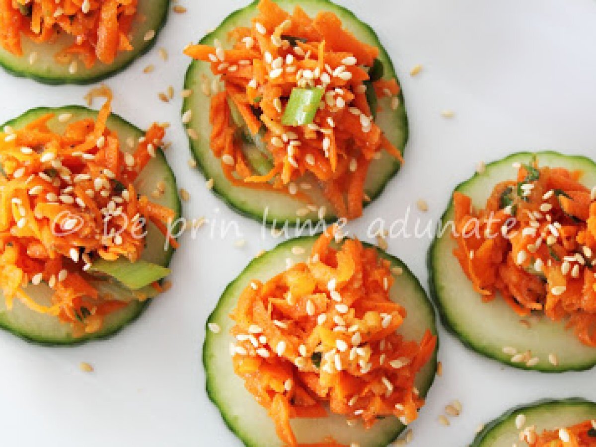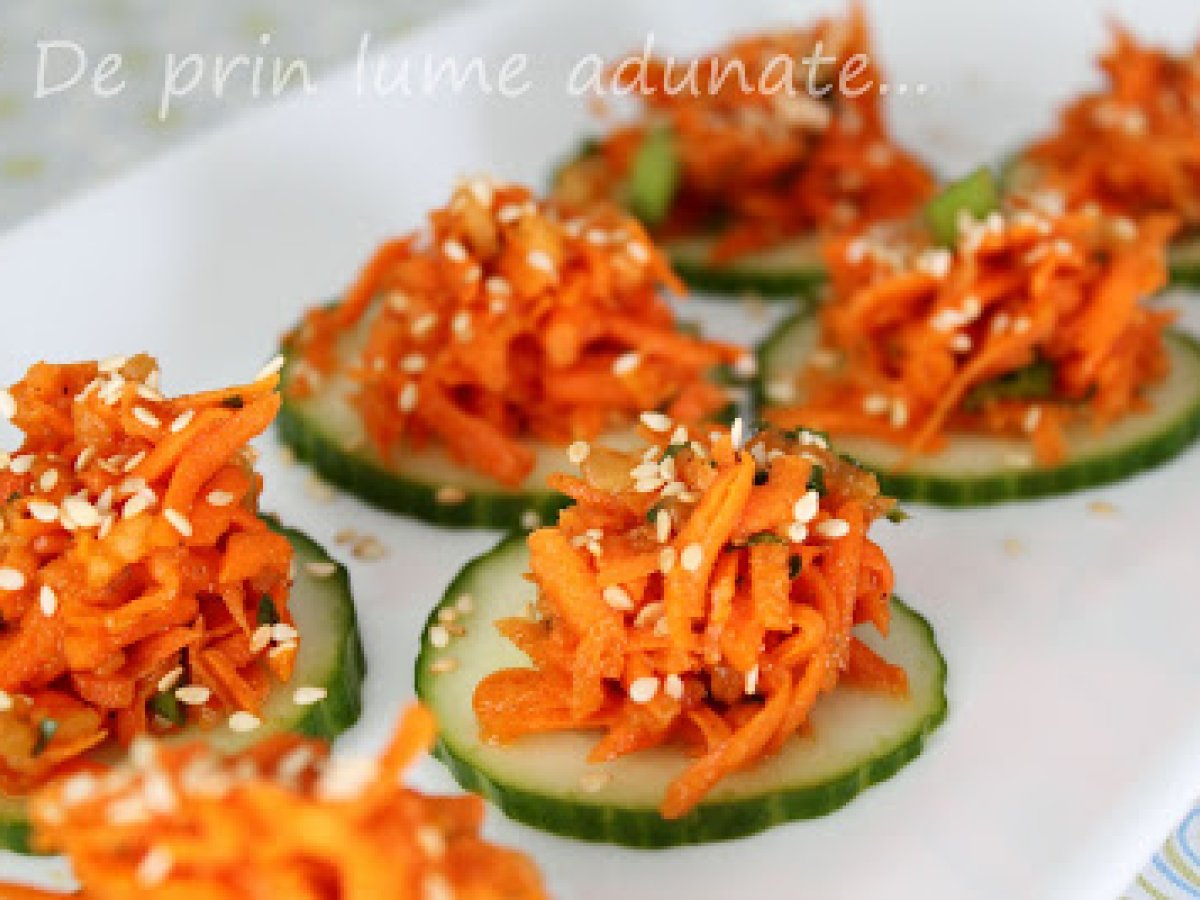 Salata de morcov si mar PrecedentulUrmătorul AperitivFoarte ușor20 min Trimite unui prieten Printează pagina Adresează o întrebare autorului Postează o poză cu rețeta gătită de tine Ingrediente 4 4 morcovi medii 1 mar curatat de coaja si seminte 1 catel de usturoi dat pe razatoarea mica 1 lingura de patrunjel tocat sare, piper proaspat macinat 1/2 lingurita ardei uscat iute zeama de la 1/2 lamaie 1 lingurita de miere 1/2 lingurita chimen macinat 1/4 lingurita boia 2 fire ceapa verde taiate felii subtiri pe diagonala 1 lingura de ulei de susan 1 lingura de ulei de masline extra virgin 2 linguri seminte de susan prajite pentru decor* felii de castravete pentru servit