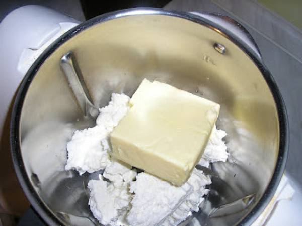 Punem in mixer branza si margarina si amestecam catava minute dupa care adaugam faina si mai amestecam cateva secunde.
