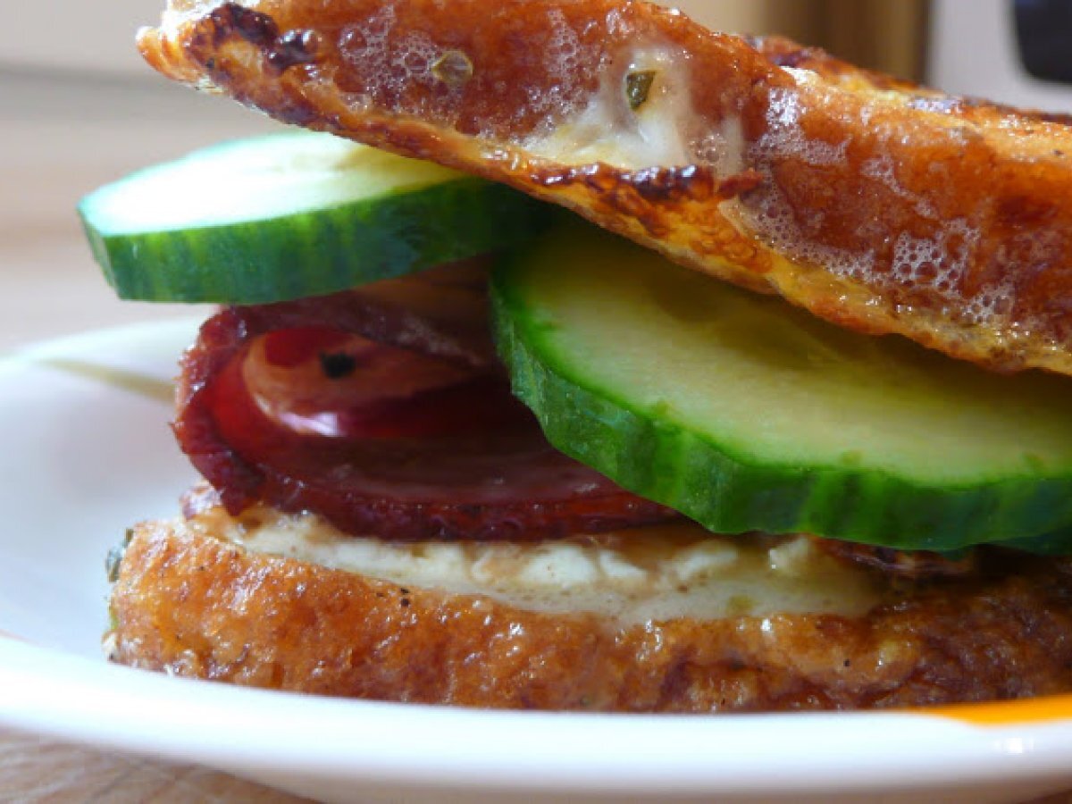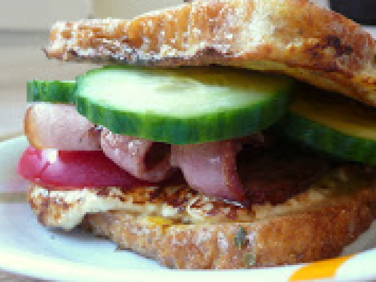 Sandwich cu friganele si branza prajita PrecedentulUrmătorul AperitivFoarte ușor20 min Trimite unui prieten Printează pagina Adresează o întrebare autorului Postează o poză cu rețeta gătită de tine Ingrediente 2 2 felii paine 1 ou 3 lg lapte 2 catei de usturoi 2 felii branza 1 felie bacon oregano castravete