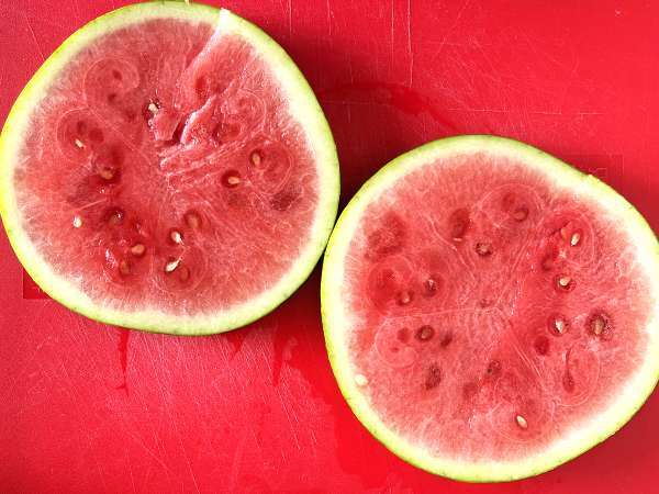 Se taie felii rotunde de pepene roșu (având grijă să nu vă tăiați!). Tăiați pe diametru.