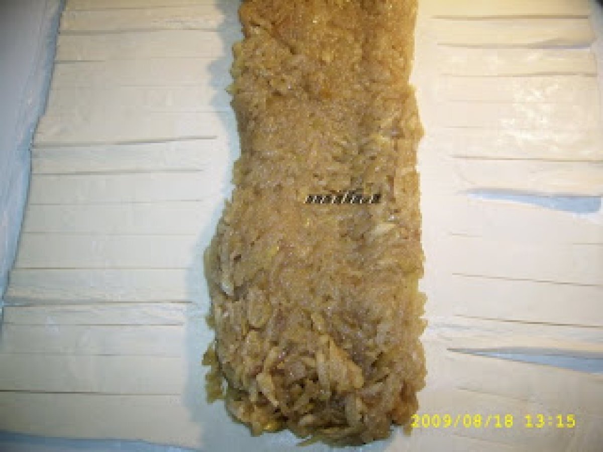 Strudel cu mere PrecedentulUrmătorul AperitivFoarte ușor1 h 10 m Trimite unui prieten Printează pagina Adresează o întrebare autorului Postează o poză cu rețeta gătită de tine Ingrediente 4 400 g aluat de foietaj 4 mere mari 4 linguri de zahar (sau dupa preferinta) 1 lingurita scortisoara 50 g unt 1 galbenus pentru uns