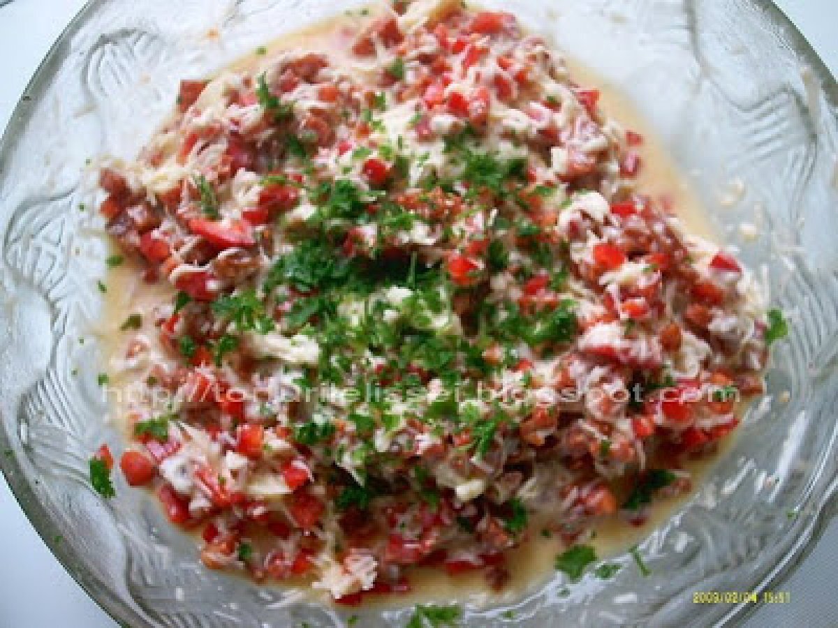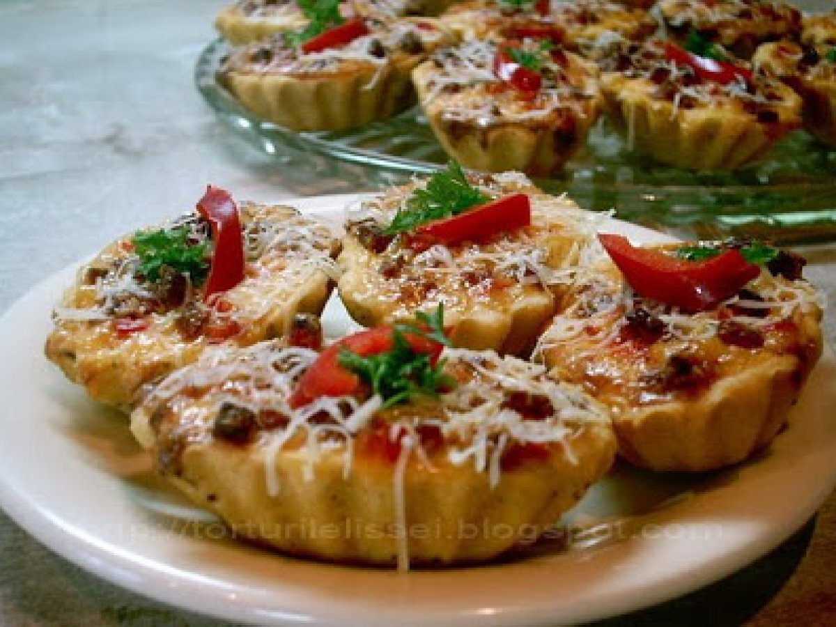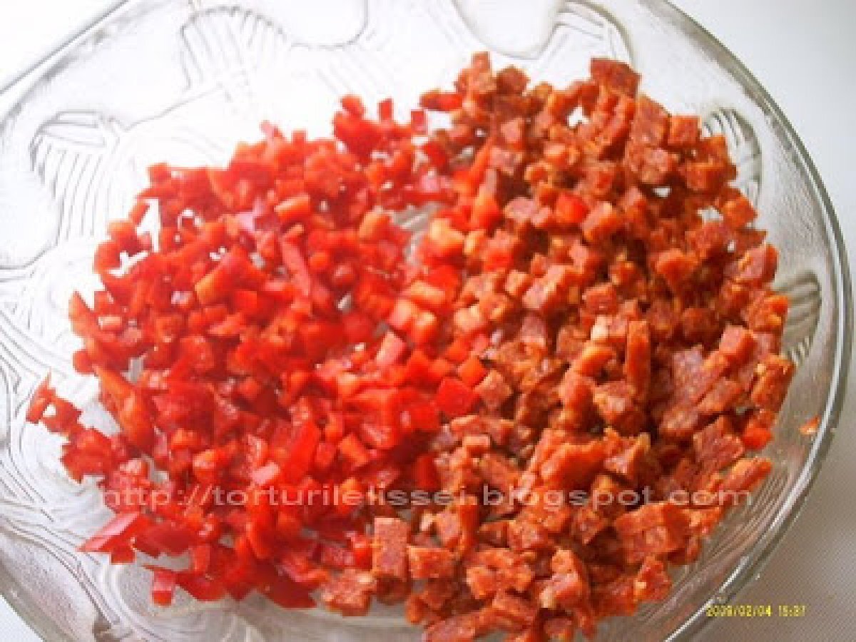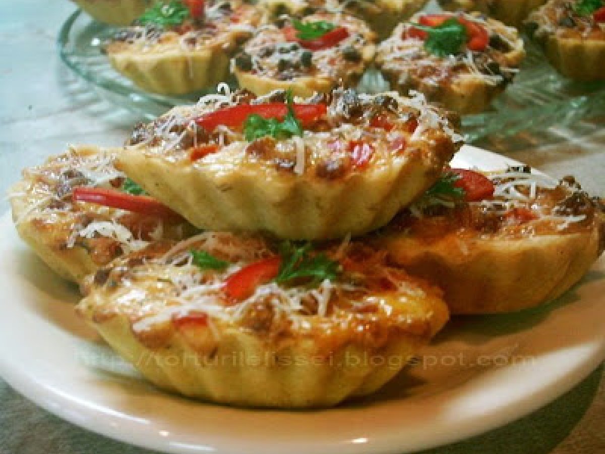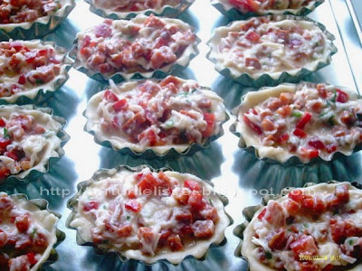 Tarte picante PrecedentulUrmătorul AperitivFoarte ușor45 min Trimite unui prieten Printează pagina Adresează o întrebare autorului Postează o poză cu rețeta gătită de tine Ingrediente 2 Aluatul: 200 g faina 100 g margarina 1 ou putina sare si piper apa cat cuprinde(cam 50ml)- 200 g salam uscat picant 1 ardei capia rosu 80 g cascaval 2 oua 1g smantana patrunjel frunze