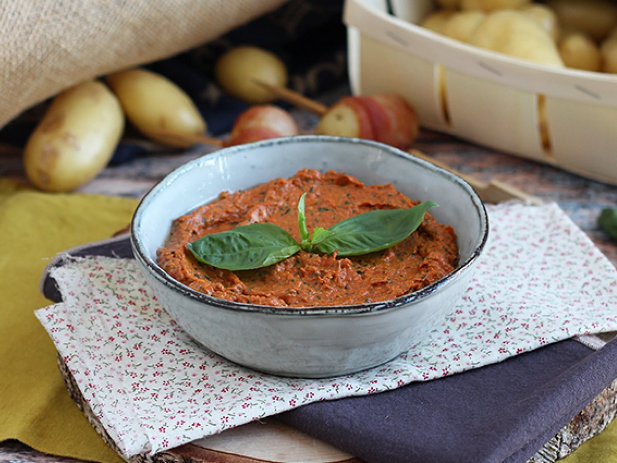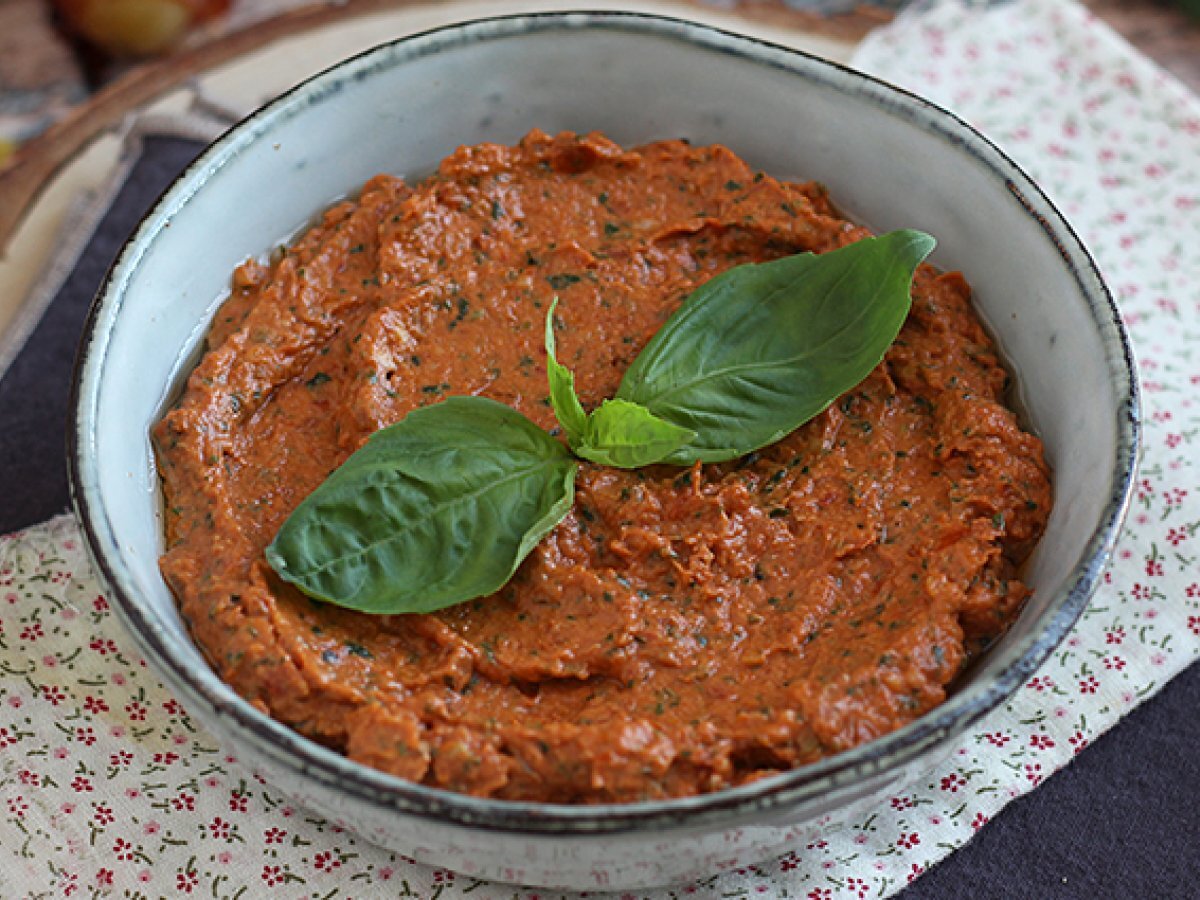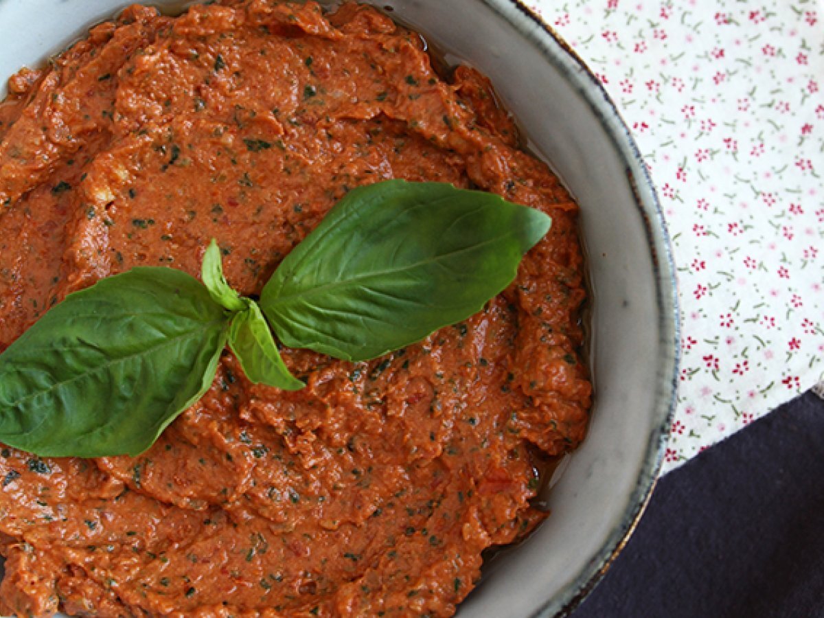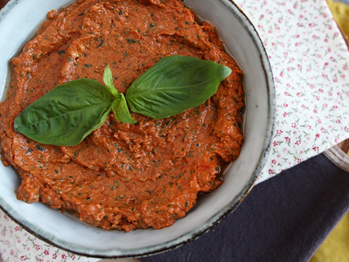 In mijlocul hummusului, guacamolului si tapenadei, prezentati aceasta pasta tartinabila de rosii uscate, usturoi si busuioc. Hiper parfumat, acest sos va fi ideal pentru a va insoti chipsurile si bastoanele de legume. Fara gatit si doar cu 4 ingrediente ;-)