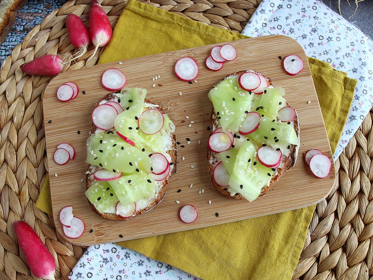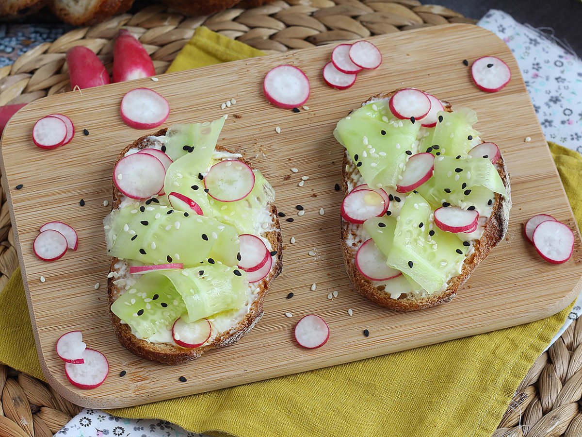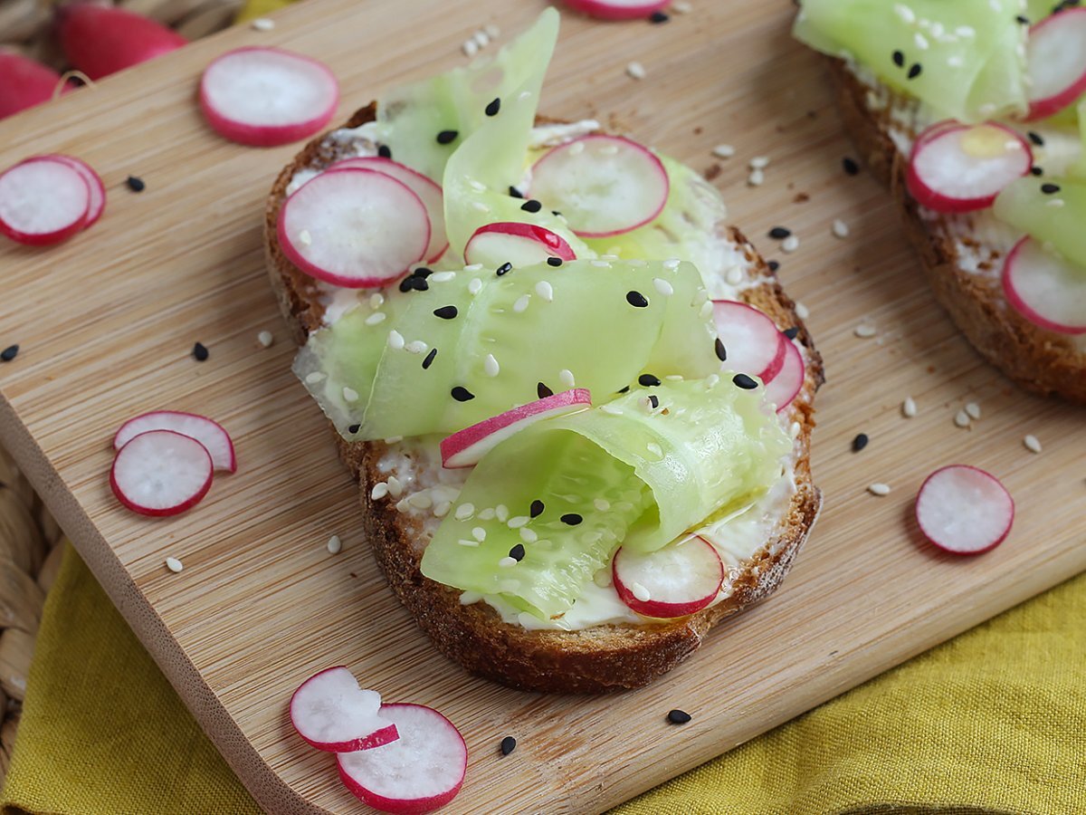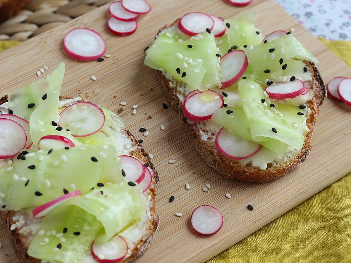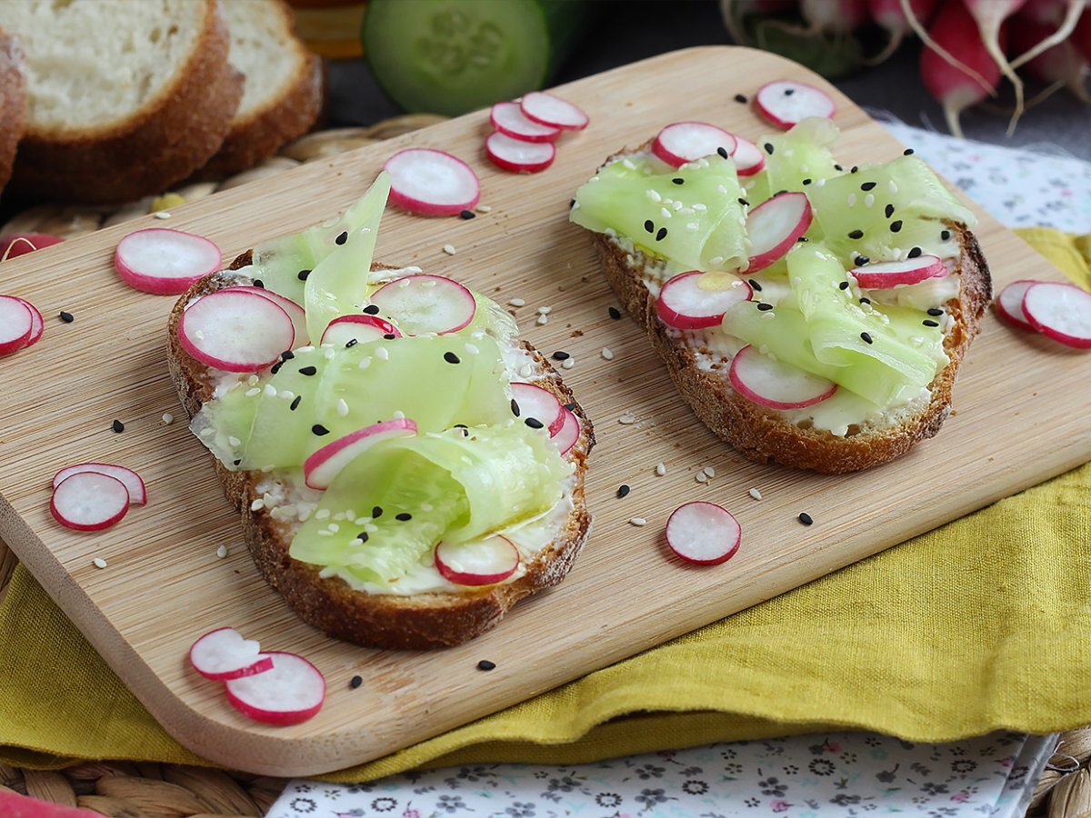 Pentru o gustare simpla si eficienta, nimic mai potrivit decat tartine! Aici, oferim o versiune vegetariana cu crema de branza, tagliatele de castraveti si rondele de ridiche.