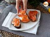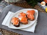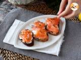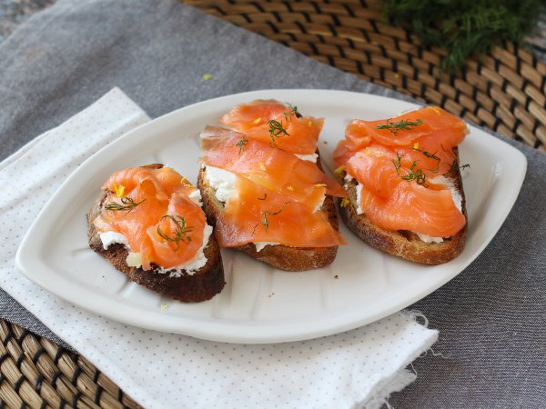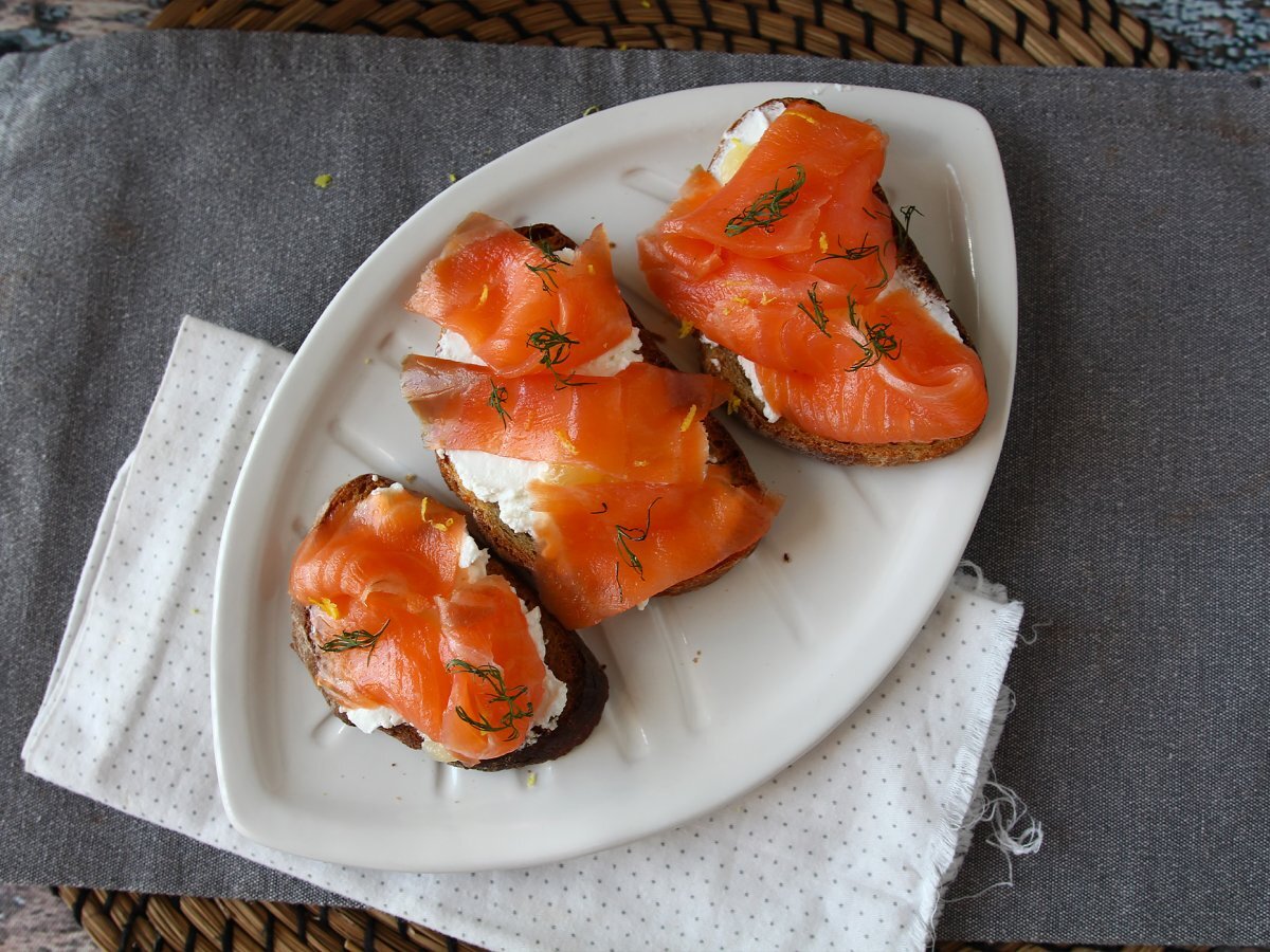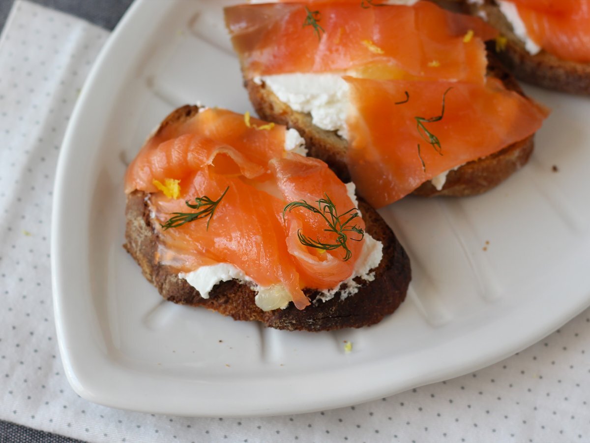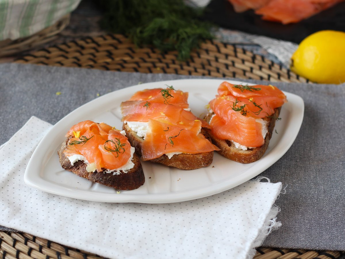 Pentru un preparat gata în mai puțin de 30 minute, nimic nu învinge pâinea, nu? Aceste felii mici cu somon afumat și brânză proaspătă de capră vor fi perfecte la prânz alături de o salată. Pentru o notă de aciditate am adăugat pulpă de lămâie, dar puteți adăuga sucul de lămâie dacă preferați :-)