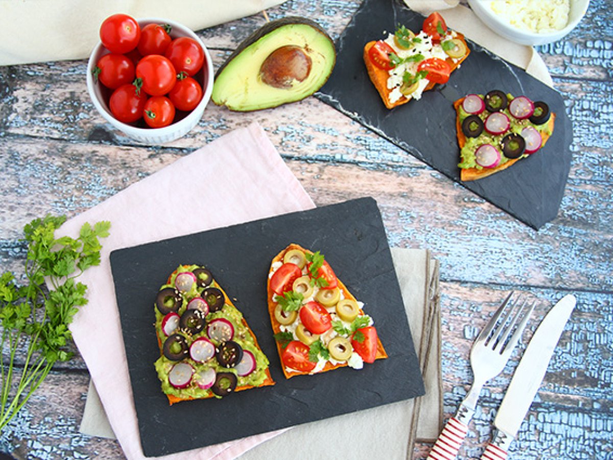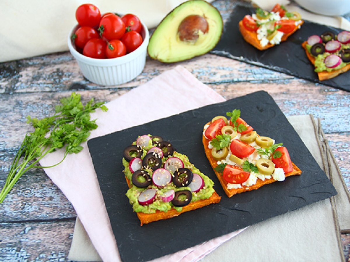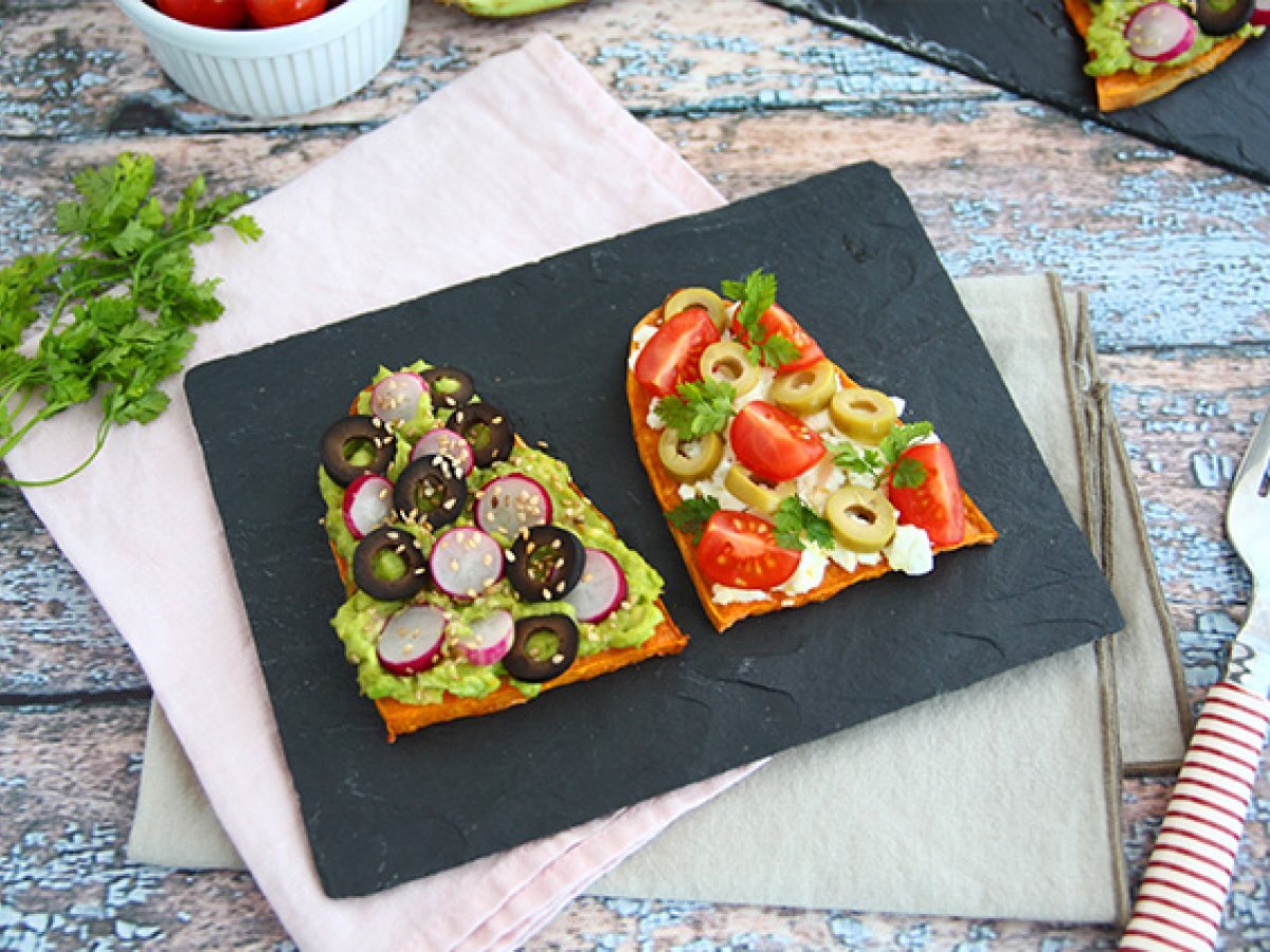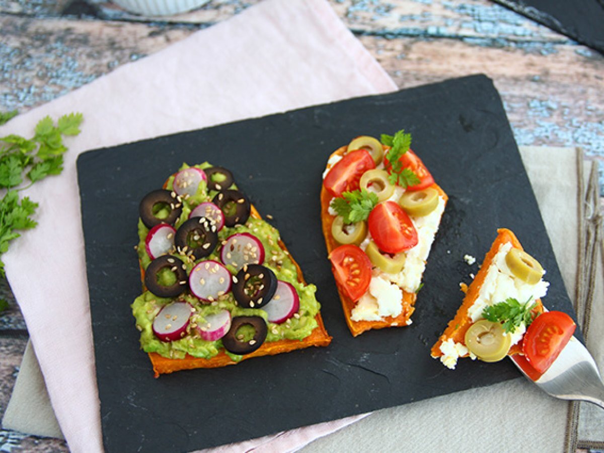 Inlocuiti feliile de paine prajita cu cartof dulce! Dupa coacere, tot ce trebuie sa faceti este sa adaugati ingredientele preferate. Avocado, branza feta, cateva felii de rosii si felii de masline ... !
