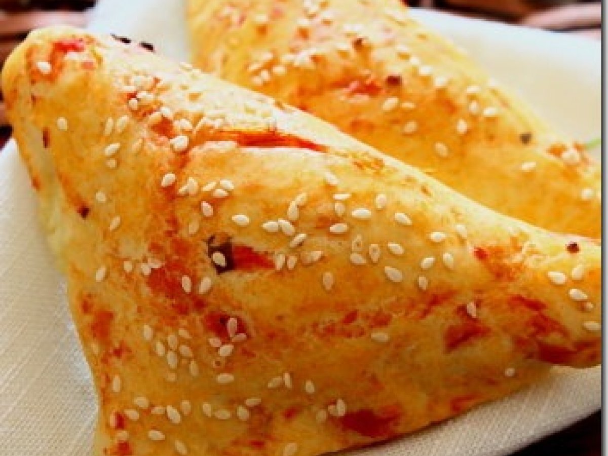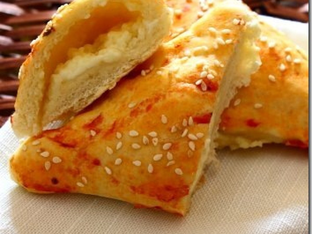 Triunghiuri cu branza PrecedentulUrmătorul AperitivFoarte ușor50 min Trimite unui prieten Printează pagina Adresează o întrebare autorului Postează o poză cu rețeta gătită de tine Ingrediente 4 500 g faina 25 g drojdie 275 g apa 4 linguri ulei masline sau floarea soarelui 1 lingurita zahar 1 lingurita sare branza pt umplutura suc de rosii susan (optional)