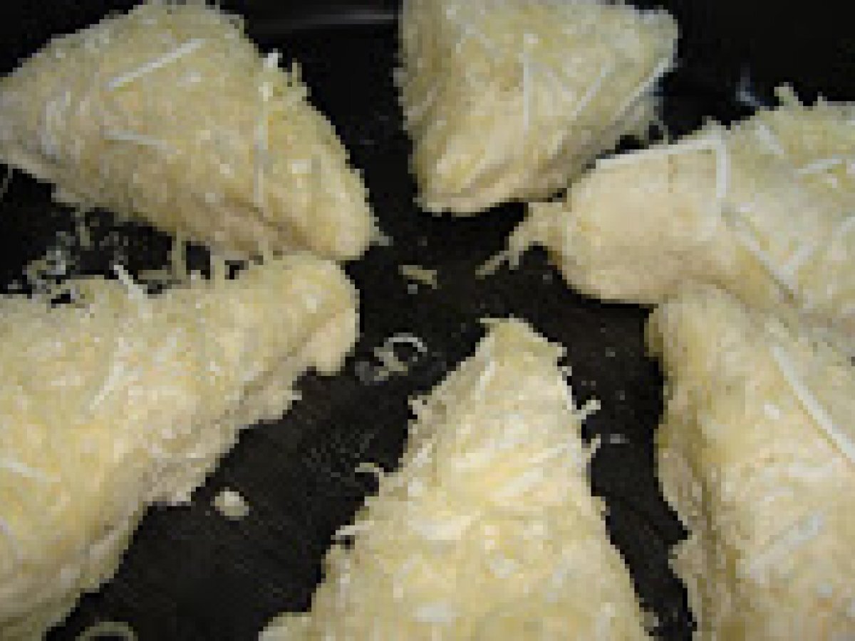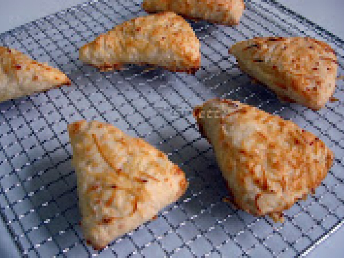 Triunghiuri cu cascaval PrecedentulUrmătorul AperitivFoarte ușor1 oră Trimite unui prieten Printează pagina Adresează o întrebare autorului Postează o poză cu rețeta gătită de tine Ingrediente 2 225 g faina 65 g unt 1 lg sare 1 lg praf copt 40 g cascaval ras 150 ml lapte pentru deasupra 2 lg lapte cascaval ras