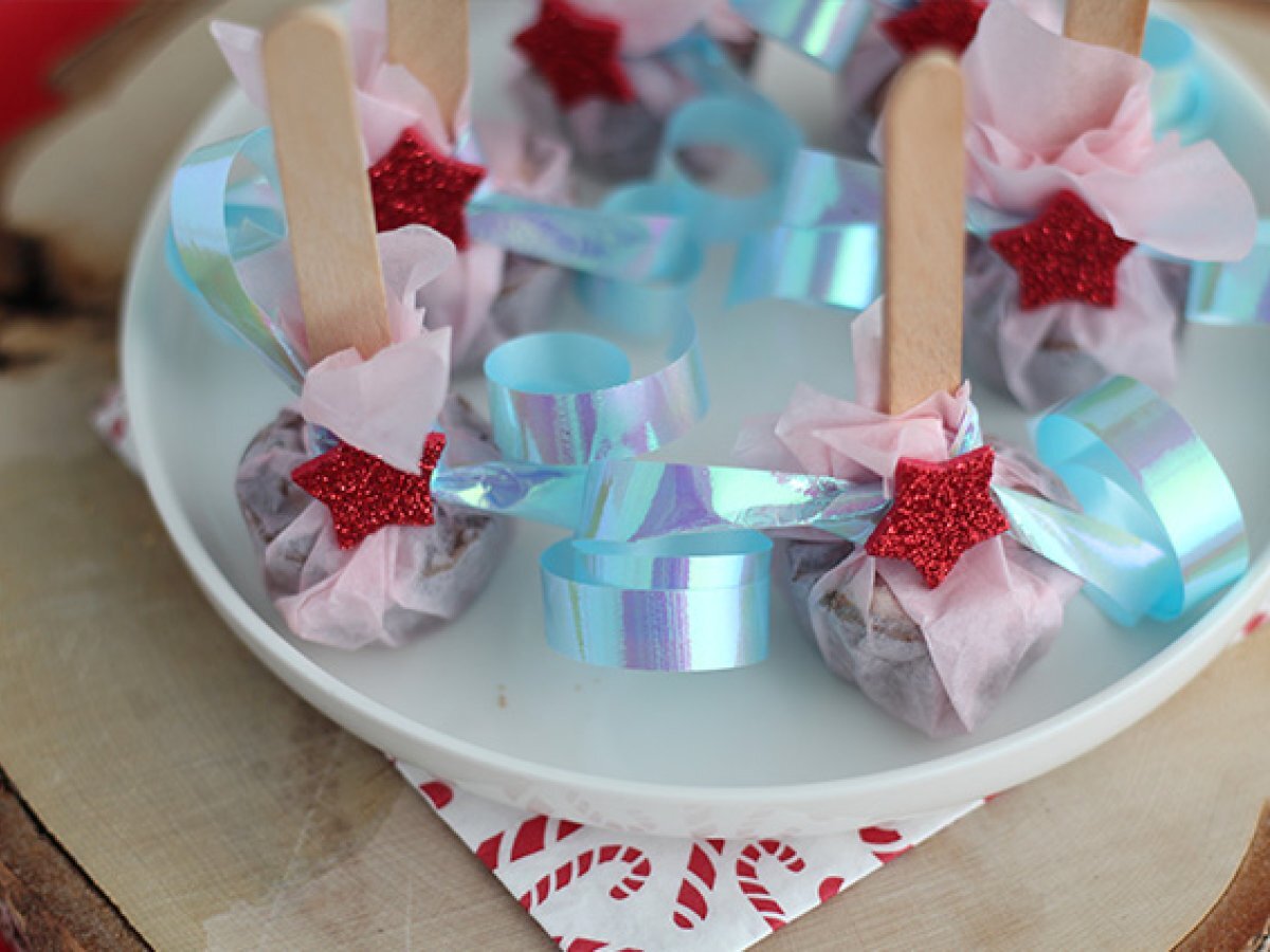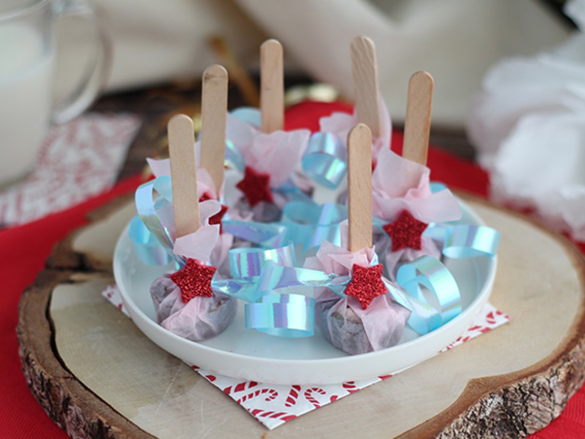 Scoateti din forme, apoi puneti-le pe patrate de hartie creponata. Strangeti hartia in jurul betisorului, apoi sigilat cu panglica. Curbati panglica cu foarfeca, apoi lipiti autocolantul pe nod.