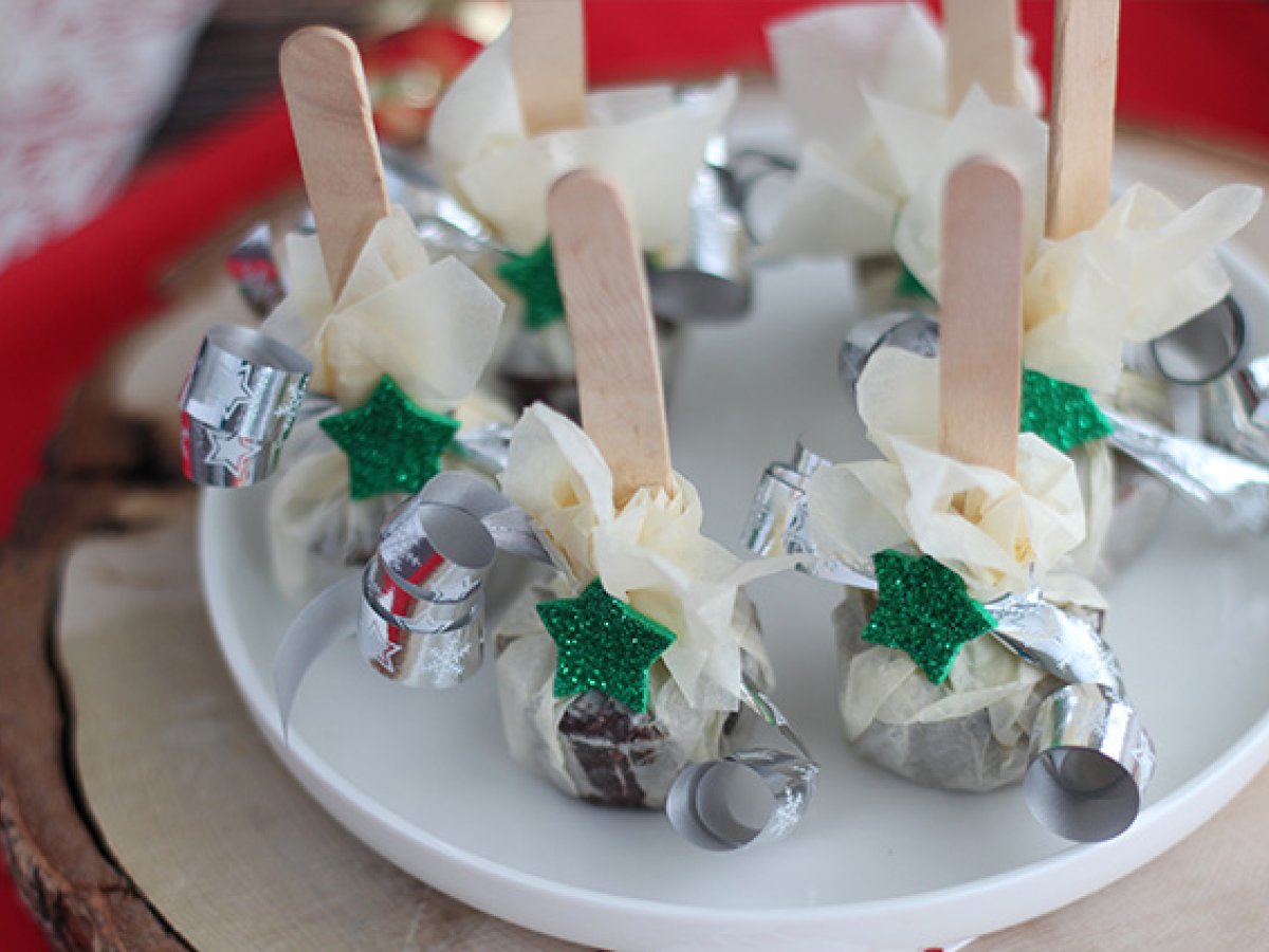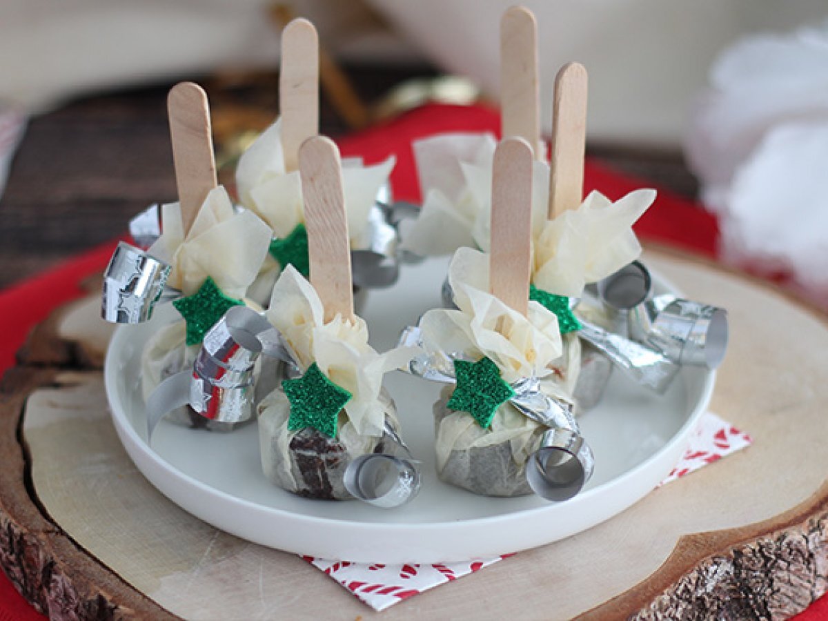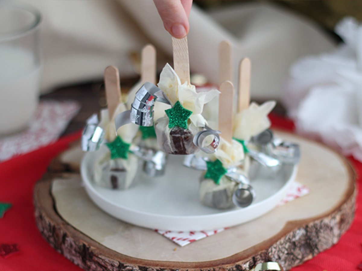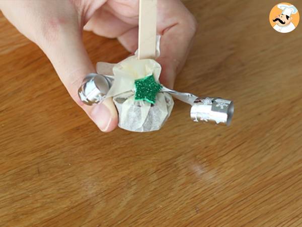 Scoateti din forme, apoi puneti-le pe patrate de hartie creponata. Strangeti hartia in jurul betisorului, apoi sigilat cu panglica. Curbati panglica cu foarfeca, apoi lipiti autocolantul pe nod.