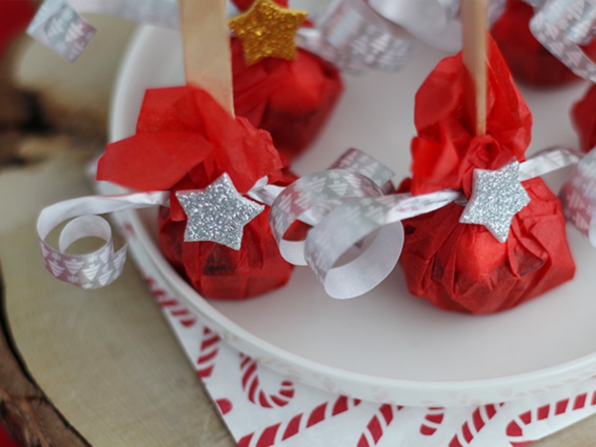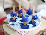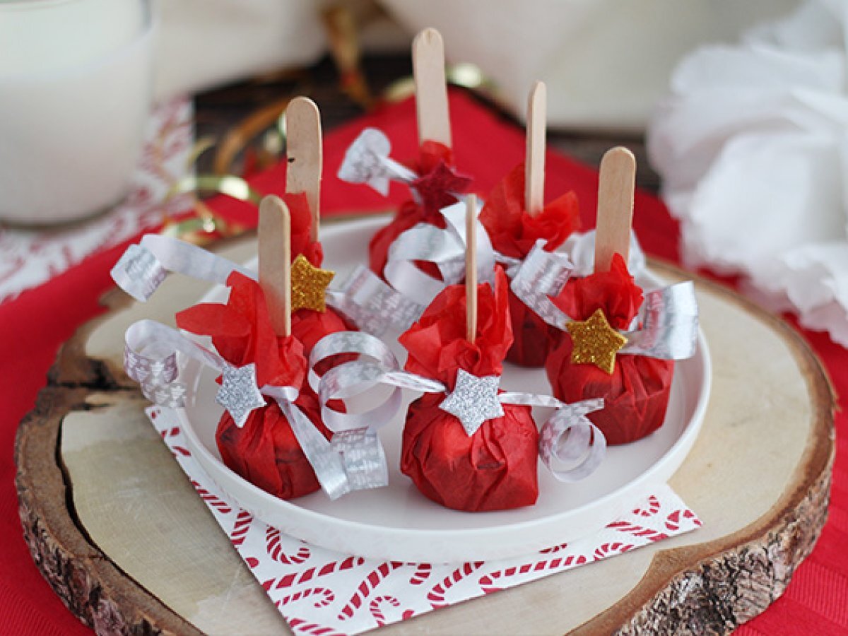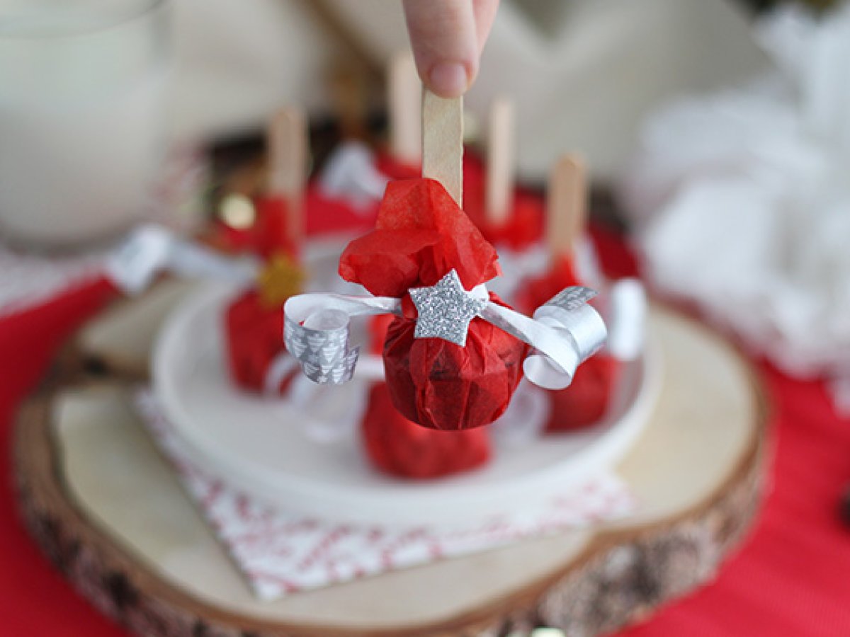Scoateti din forme, apoi puneti-le pe patrate de hartie creponata. Strangeti hartia in jurul betisorului, apoi sigilat cu panglica. Curbati panglica cu foarfeca, apoi lipiti autocolantul pe nod.