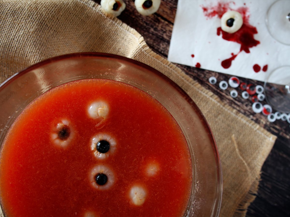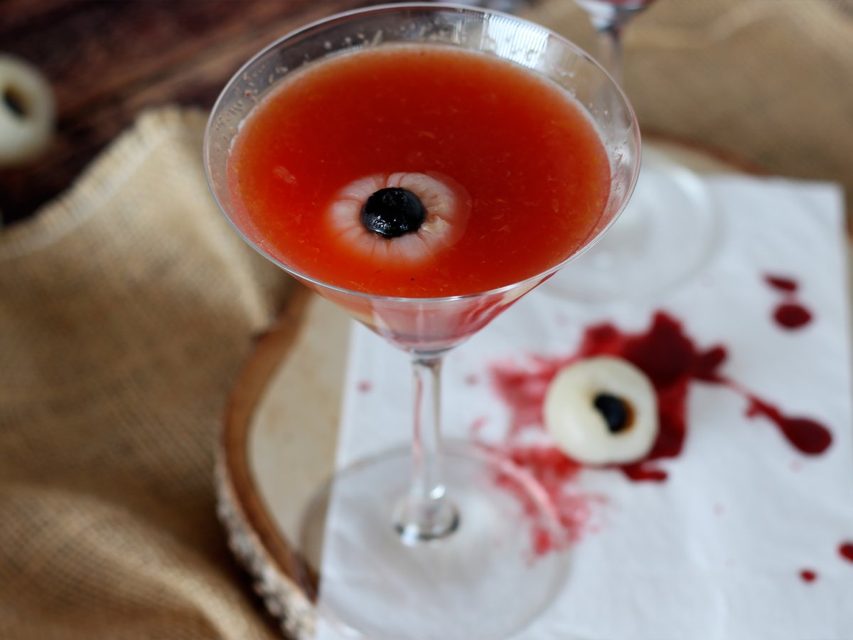 Puteți decora cocktailul cu coulis de fructe roșii în fundul paharului și un ochi de litchi deasupra pentru un efect înfricoșător și festiv.