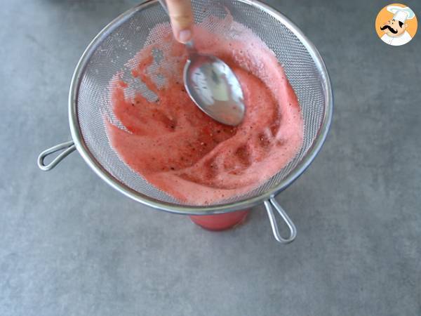 Adaugati ginul si amestecati din nou. Strecutati amestecul pentru a indeparta semintele si turnati jumatate din amestec in pepenele verde scobit.