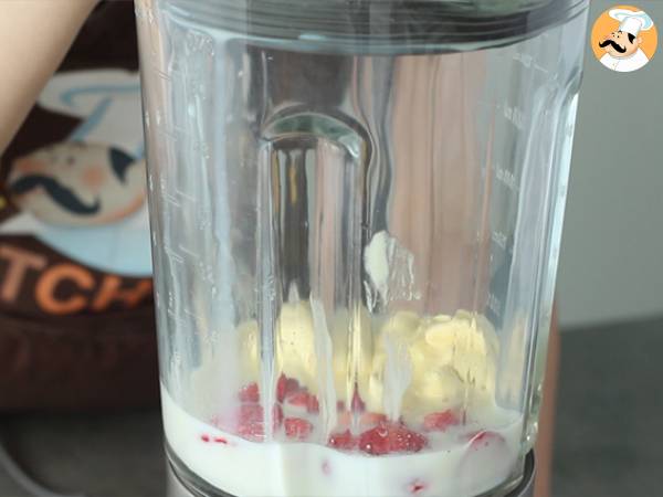Puneti cupele de inghetata de vanilie si capsunele intr-un blender, turnați laptele si amestecati.