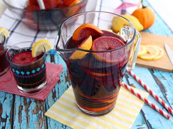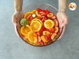 Intr-un castron mare de salata, amestecati vinul alb sec cu zaharul brun. Adaugati feliile de lamaie si portocala, bucatile de capsune si caise. Se amesteca si se pune la rece o ora.