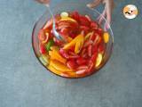 Taiați cateva capsune mici in jumatati. Luati frunze mici de menta. Taiati portocala si lamaia verde in felii. Taiați capsunele si caisele in 4. Puneti limonada in frigider.