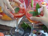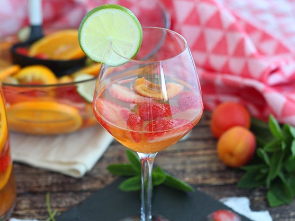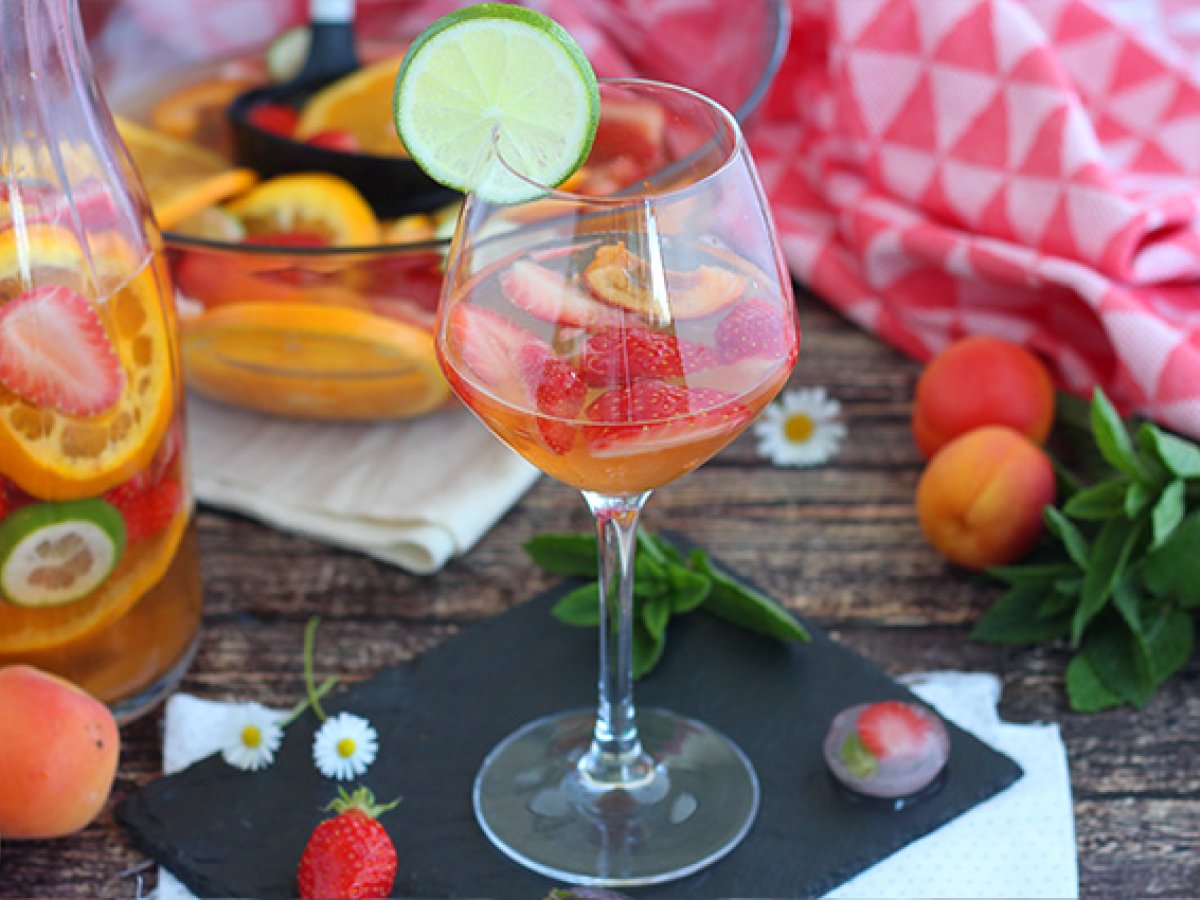 Sangria (cu vin rosu) o cunoastem cu totii, dar ati gustat vreodata sangria cu vin alb? La fel de proaspata si usor de facut, aceasta sangria este plina cu fructe proaspete si va mirosi vara! Mai mult, cuburile noastre de gheata compuse din capsuni si frunze de menta vor garanta succesul.