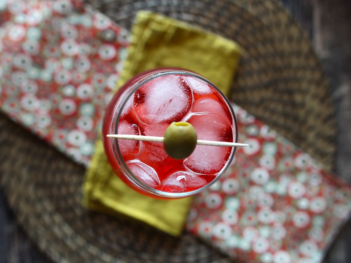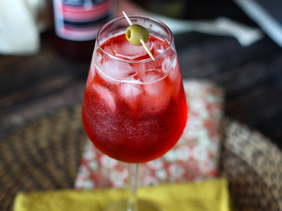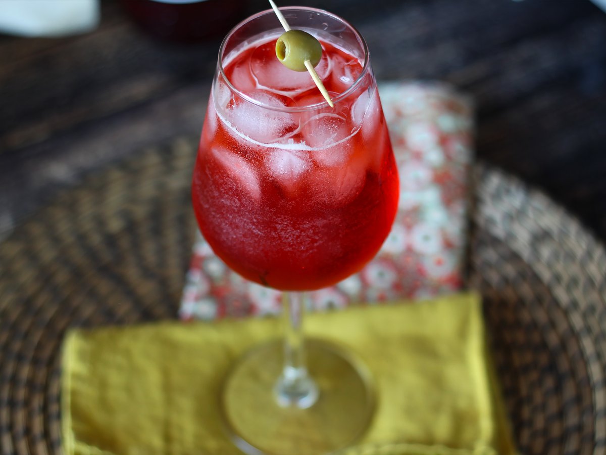 - La final, umpleți paharul cu apă minerală carbogazoasă și decorați cu o măslină verde