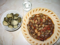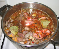 boghi, bobi de fasole - 500groase garf, sau orice alt fel de oase, carne de porcceap? - una potrivit?zarzavat - morcov, p?trunjel, ?elin?, ardei, gogo?ar (eu folosesc zarzavatul conservat pentru iarn? - home made)suc de ro?ii - 100grro?ii cherry - vreo 5-6 buccondimente: frunze dafin, piper boabe, boia de ardei dulce, o crengu?? de cimbru (neap?rat)delikat Pui boghii la fiert vreo juma de or? ?i îi scurgi de ap? de dou? ori. Apoi separat c?le?ti ceapa t?iat? cubule?e peste care adaugi oasele garf, sucul de ro?ii ?i cele câteva ro?ii cherry. La?i totul la foc mic vreo 10 min.