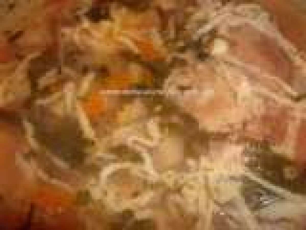 Carnea de ra?? se por?ioneaz? ?i se pune la fiert în ap? cu sare. Se spumeaz? cât este necesar ?i apoi se adaug? zarzavatul t?iat si ceapa tocat?.Se adauga si pasta de rosii.Cand carnea este fiarta se adauga borsul si taiteii(fierti si scursi ),se potriveste de acru si sare.Se adauga verdeata tocata marunt.