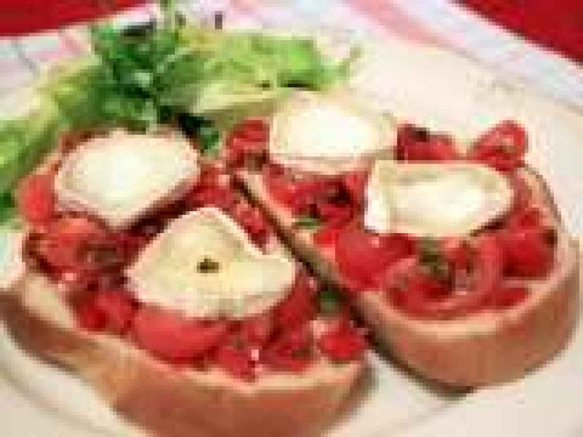 Apoi, pe post de "cireasa de pe tort" am asezat cateva felii debranza de capra pe fiecare bruscheta, si le-am mai lasat inca 2 minute la cuptor, cat sa inceapa branza sa se topeasca.