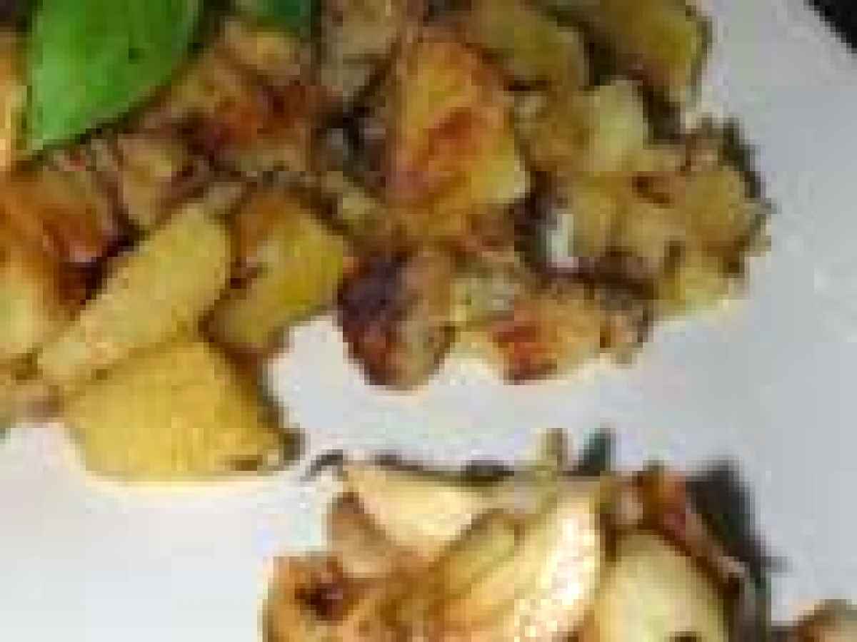 Ingrediente:? 2 linguri ulei de masline ? 1 capatana de usturoi, desfacuta, dar cateii de usturoi sa fie necuratati de coaja ? 2 lingurite ghimbir macinat ? 2 lingurite cumin ? 2 lingurite majoran ? 675 gr cartofi, decojiti si taiati cubulete ? sare si piper ? 100 ml apa ? zeama de la ½ lamaie
